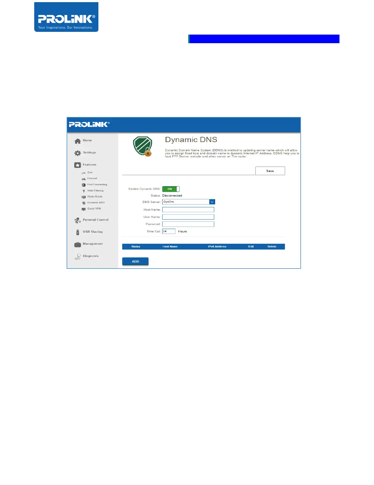• Status: Displays the current dynamic DNS connection Status.