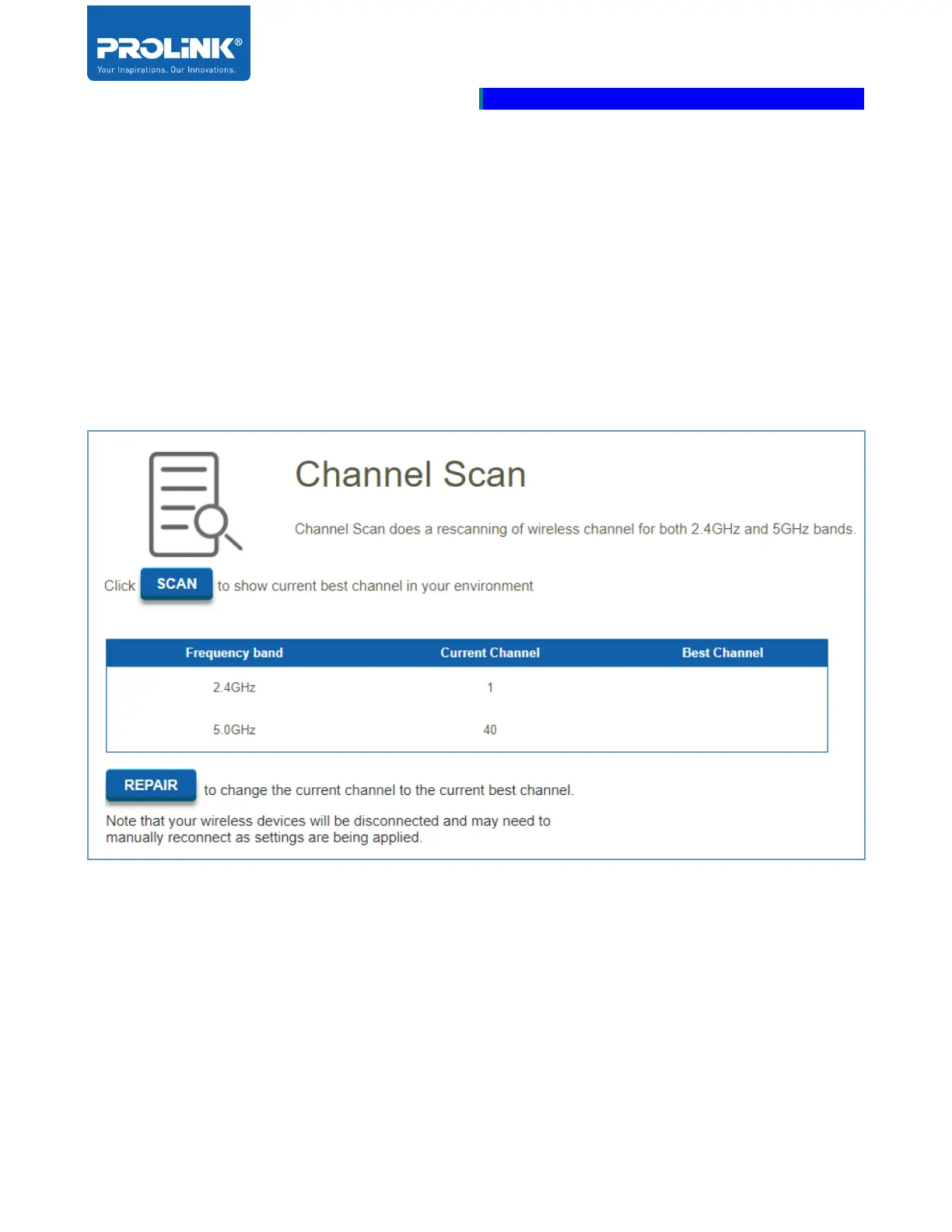 Click the SCAN to initiate Channel Scan for the best channel for the wireless 2.4GHz and 5GHz