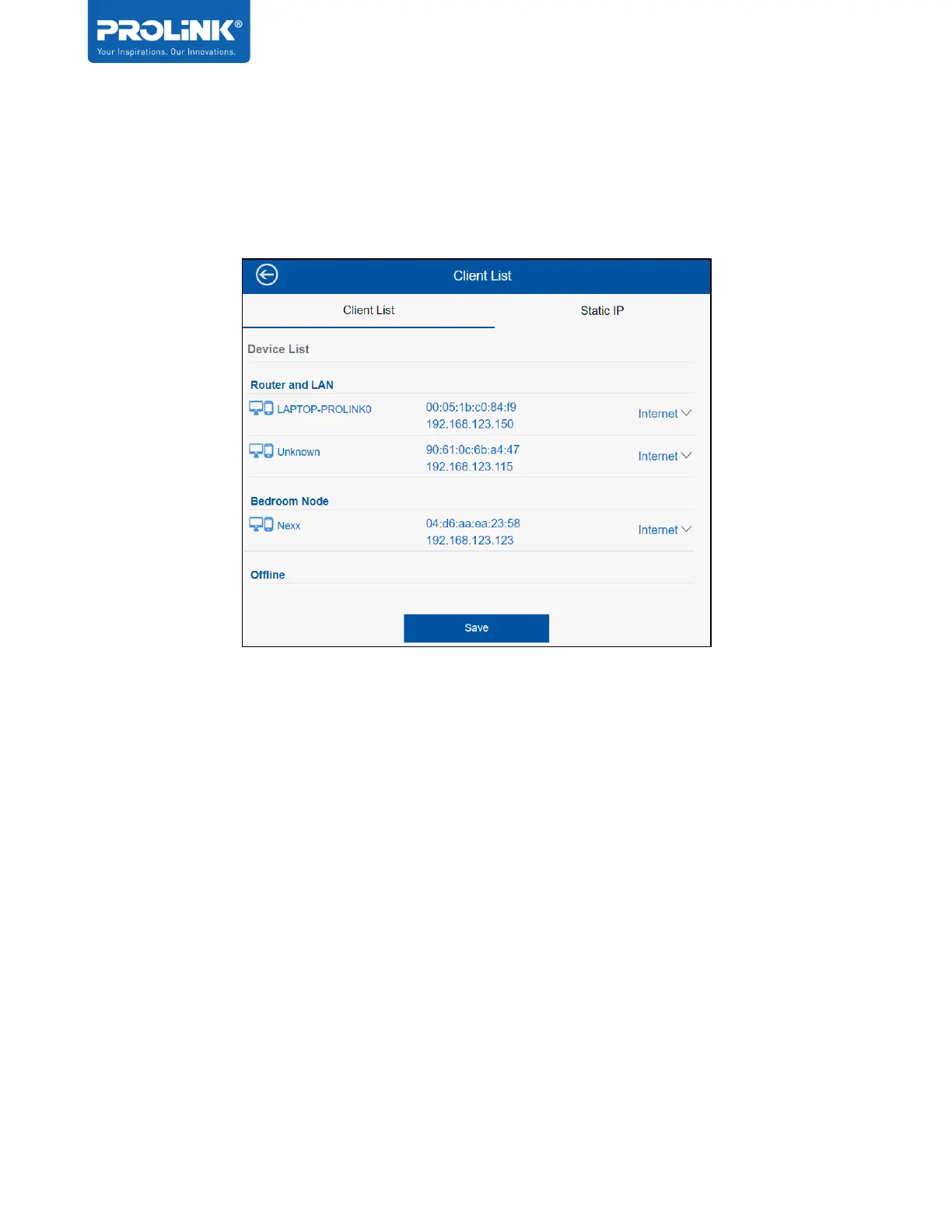 User also can further set Internet blocking on respective of the device connected, or limit the