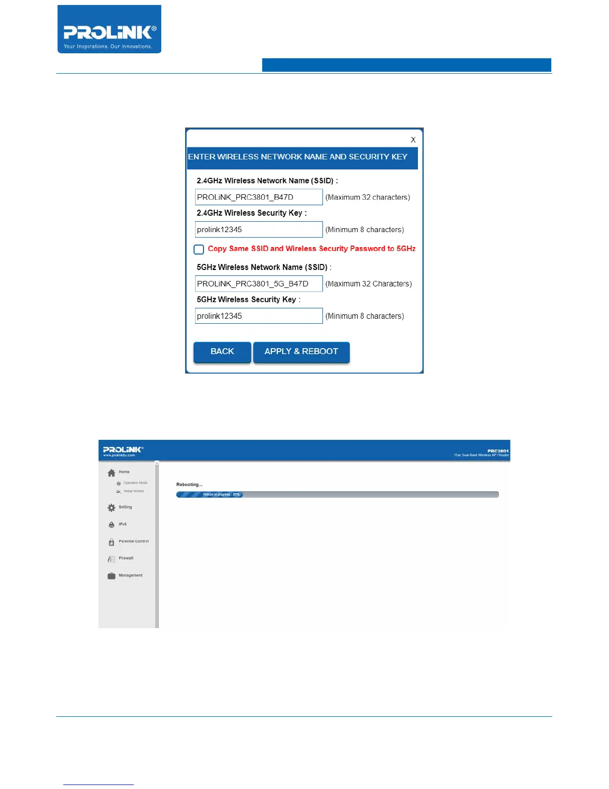 4. After finish enter the SSID and password click “APPLY AND REBOOT” for PRC3801 to