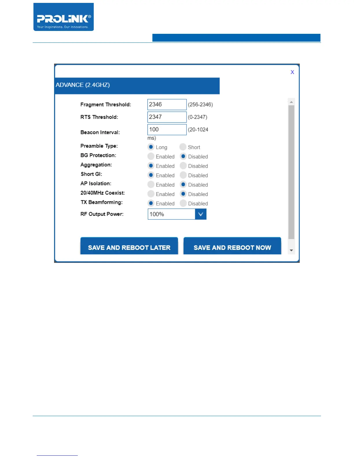 • Fragment Threshold: This value is the maximum whether packet will be fragmented. Setting