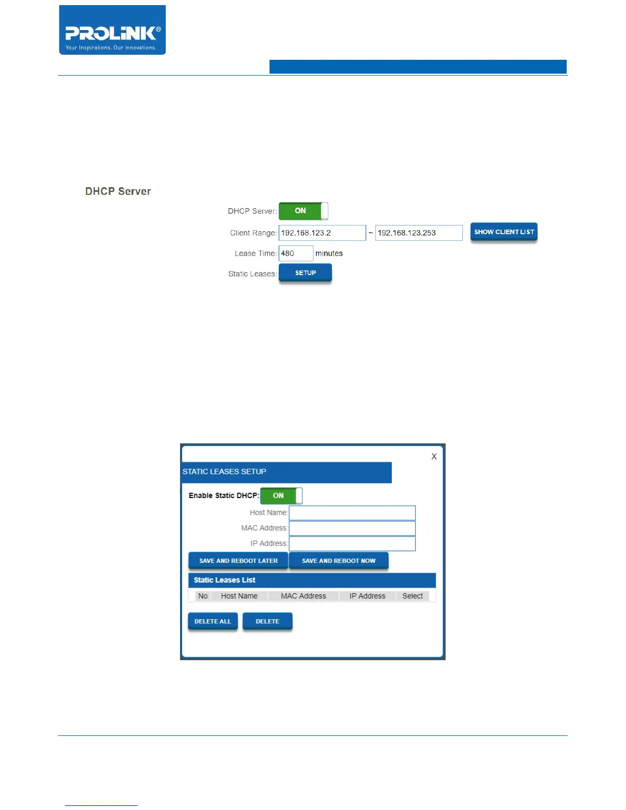 • Client Range: Enter the starting and ending IP addresses for the DHCP server’s IP assignment.