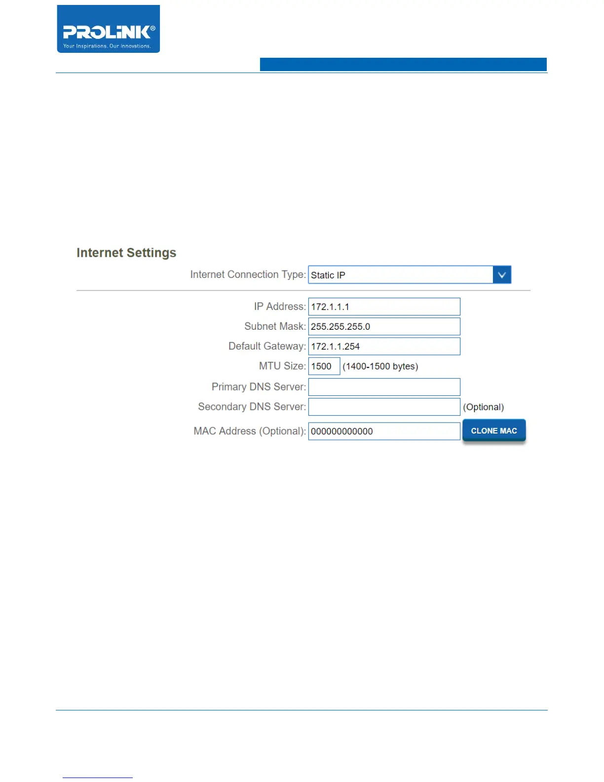 interface MAC address on the router. You can use “CLONE MAC” button to replace the