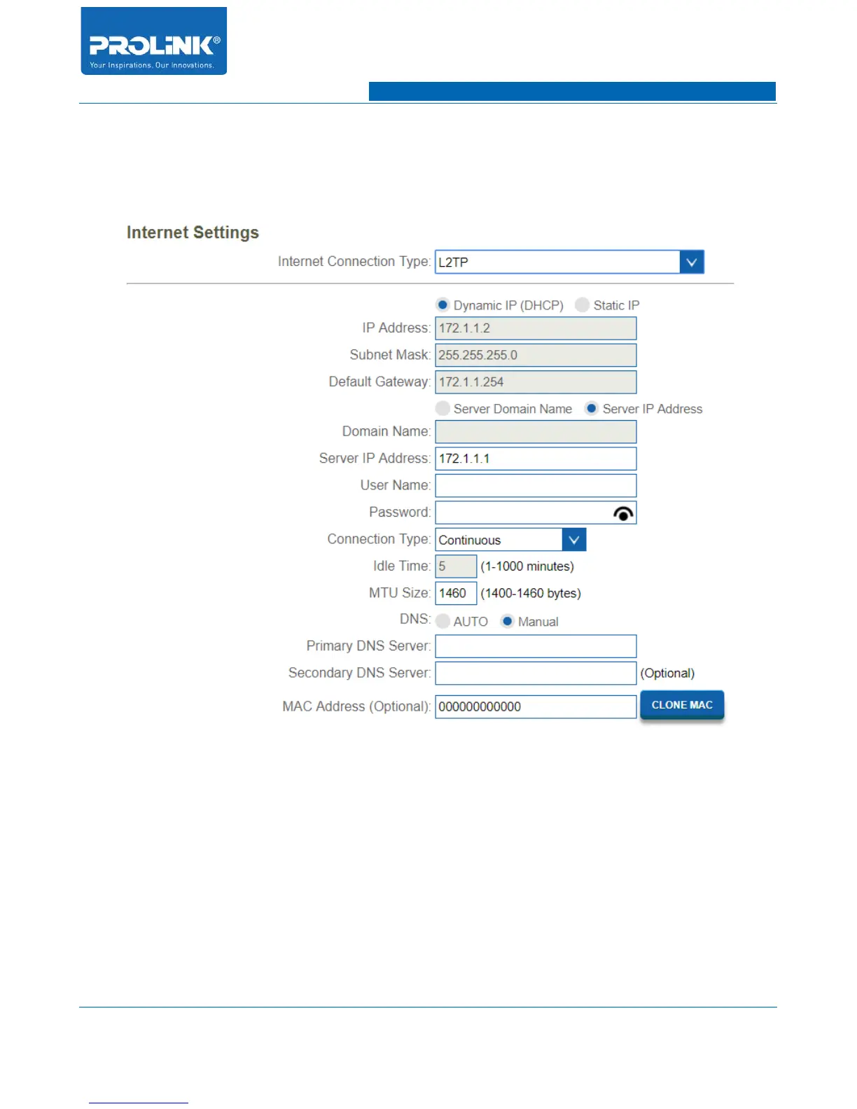 • Subnet Mask: Enter the L2TP Subnet Mask provided by your ISP (for Static IP only).