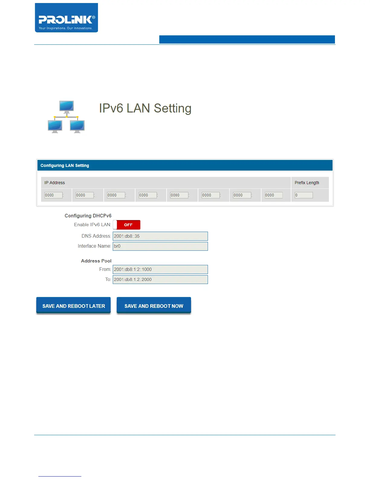 Go to IPv6 → IPv6 LAN Setting to enter configuration page. IPv6 LAN Setting only available if you