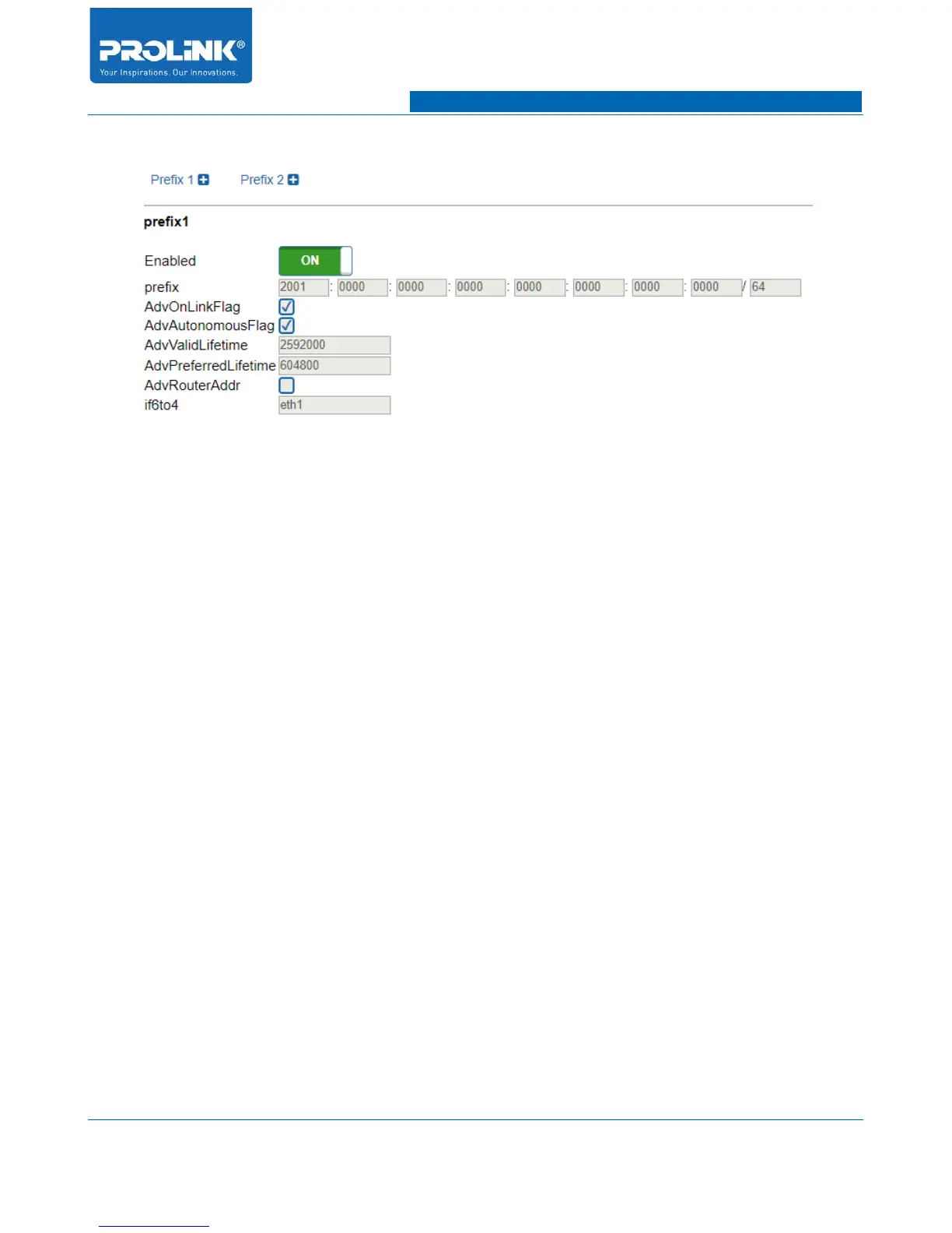 • AdvValidLifetime: Enter the advertises length of time in seconds that the prefix is valid for