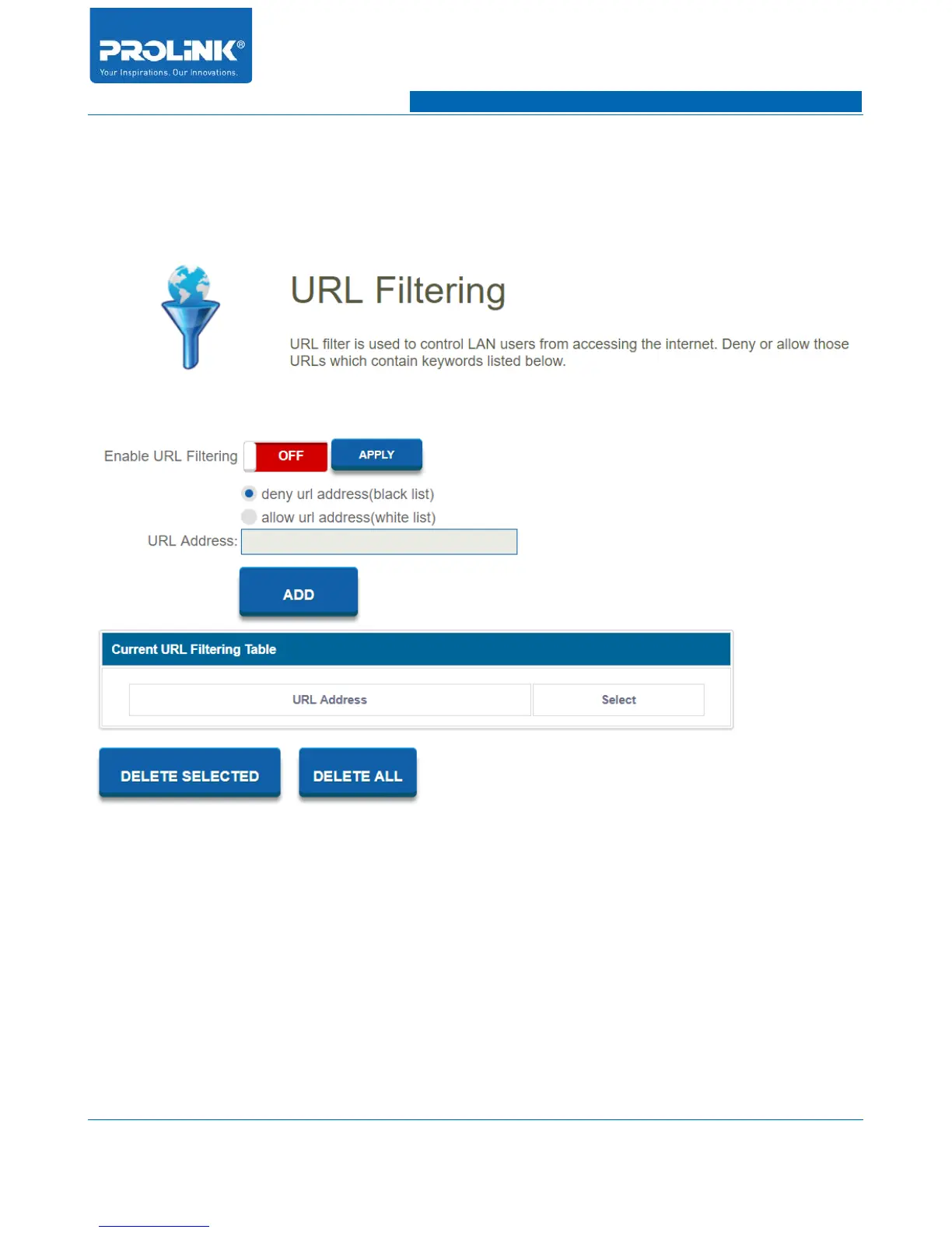 • Enable URL Filtering: Enable or disable URL Filtering function.