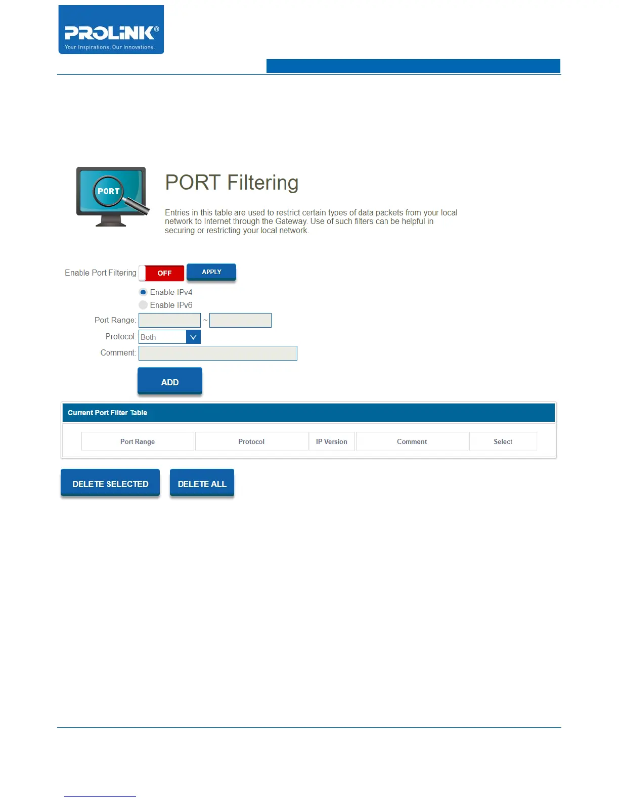 • Enable Port Filtering: Enable and disable Port Filtering function.