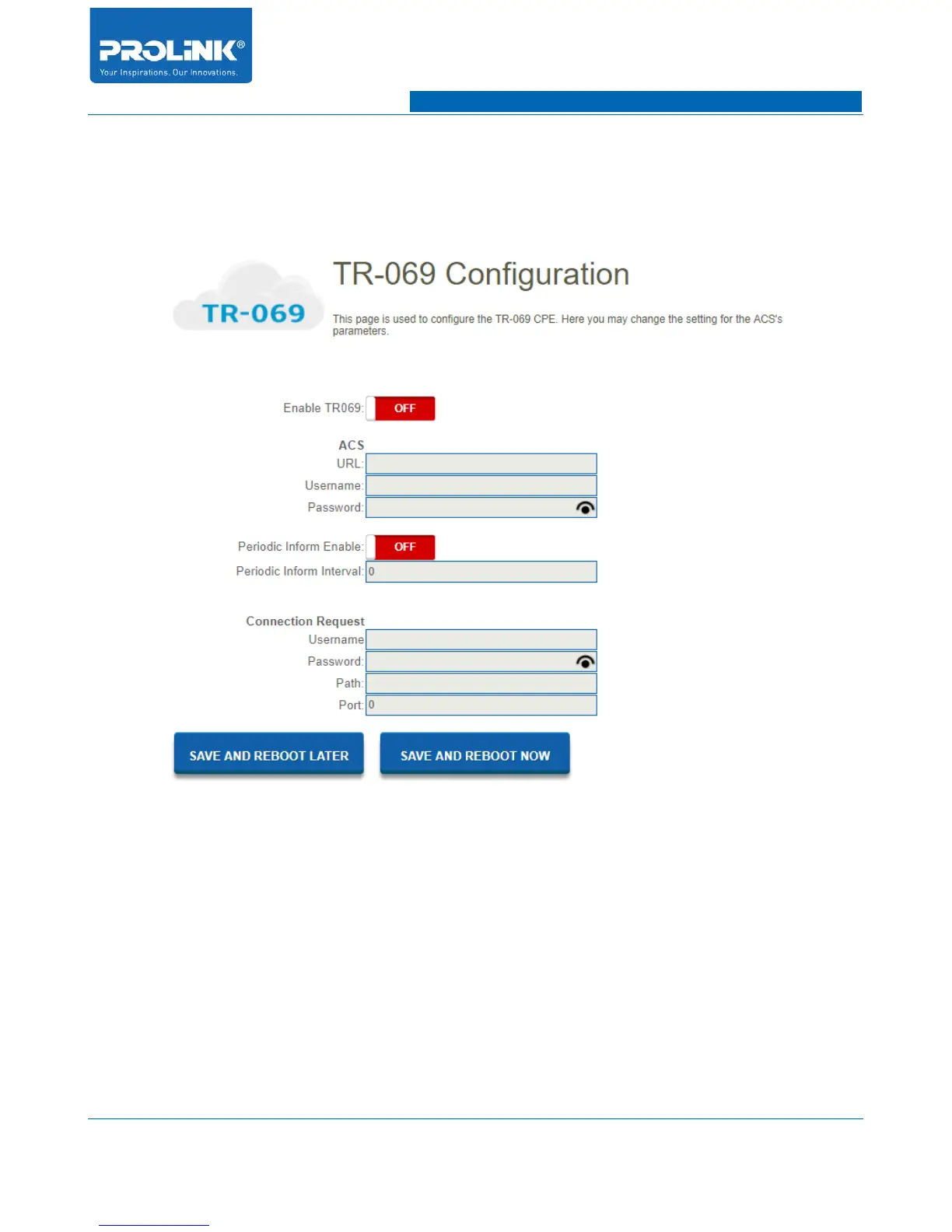 Go to Management → TR-069 to enter configuration page. TR-069 is a DSL Forum specification for