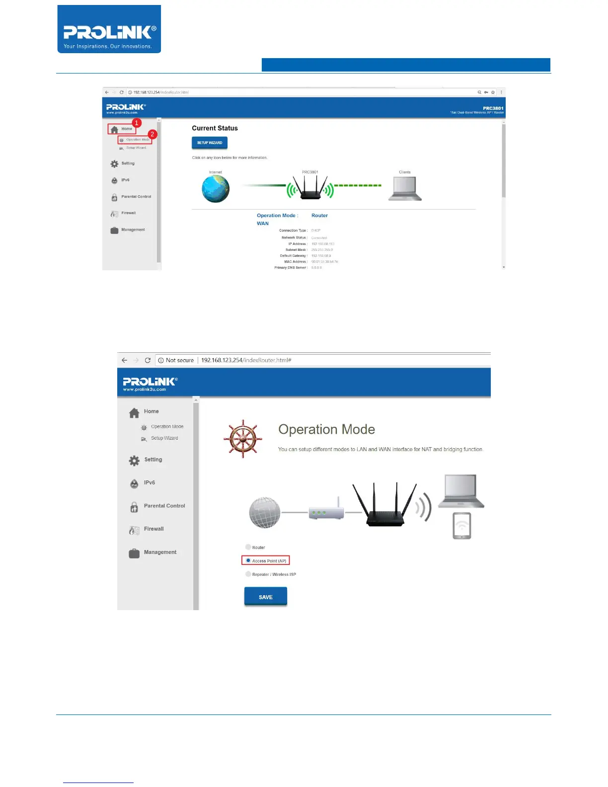 5. In Operation Mode page select Access Point (AP) then click “SAVE AND REBOOT”.
