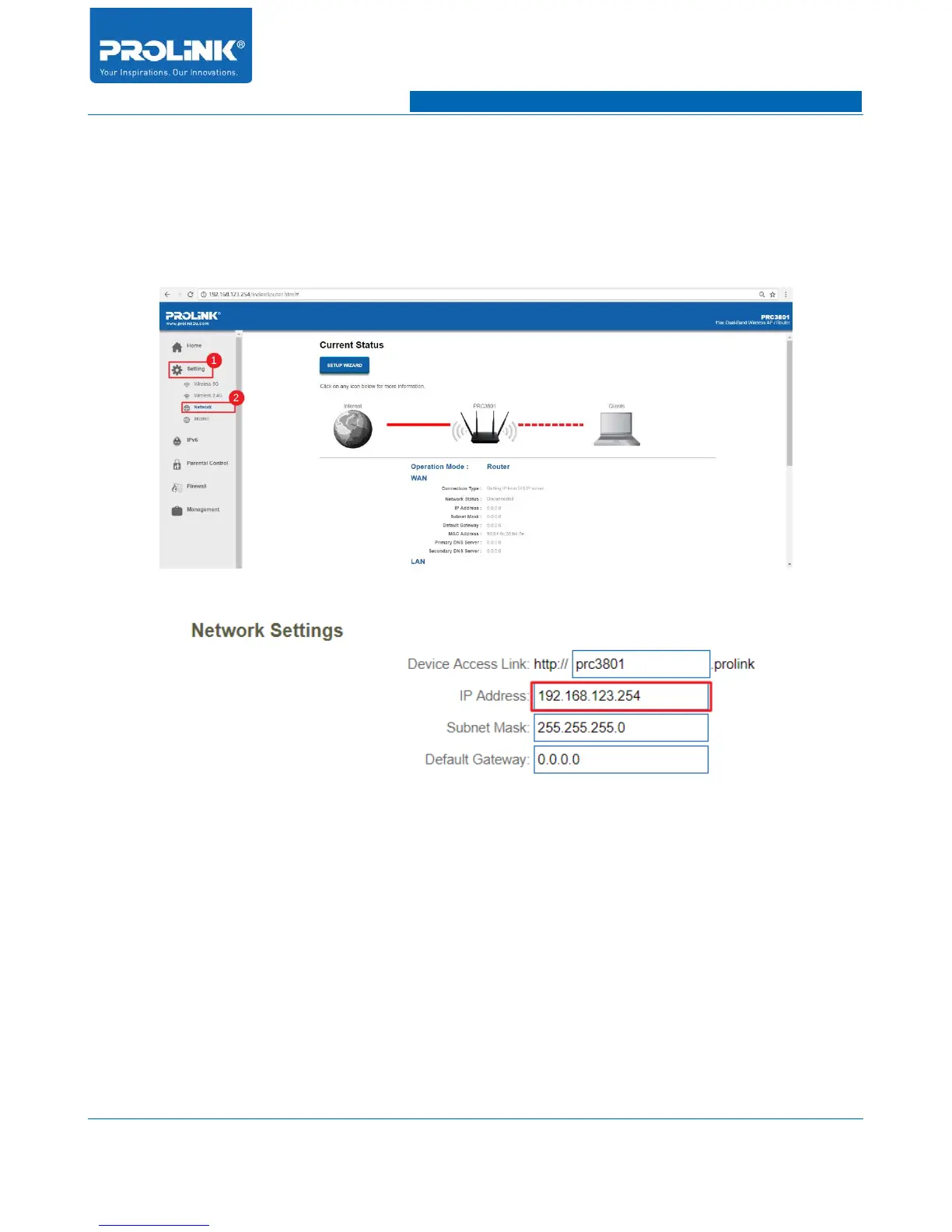 mode, login to PRC3801 Main Page. Go to Setting → Network to enter Network Setting