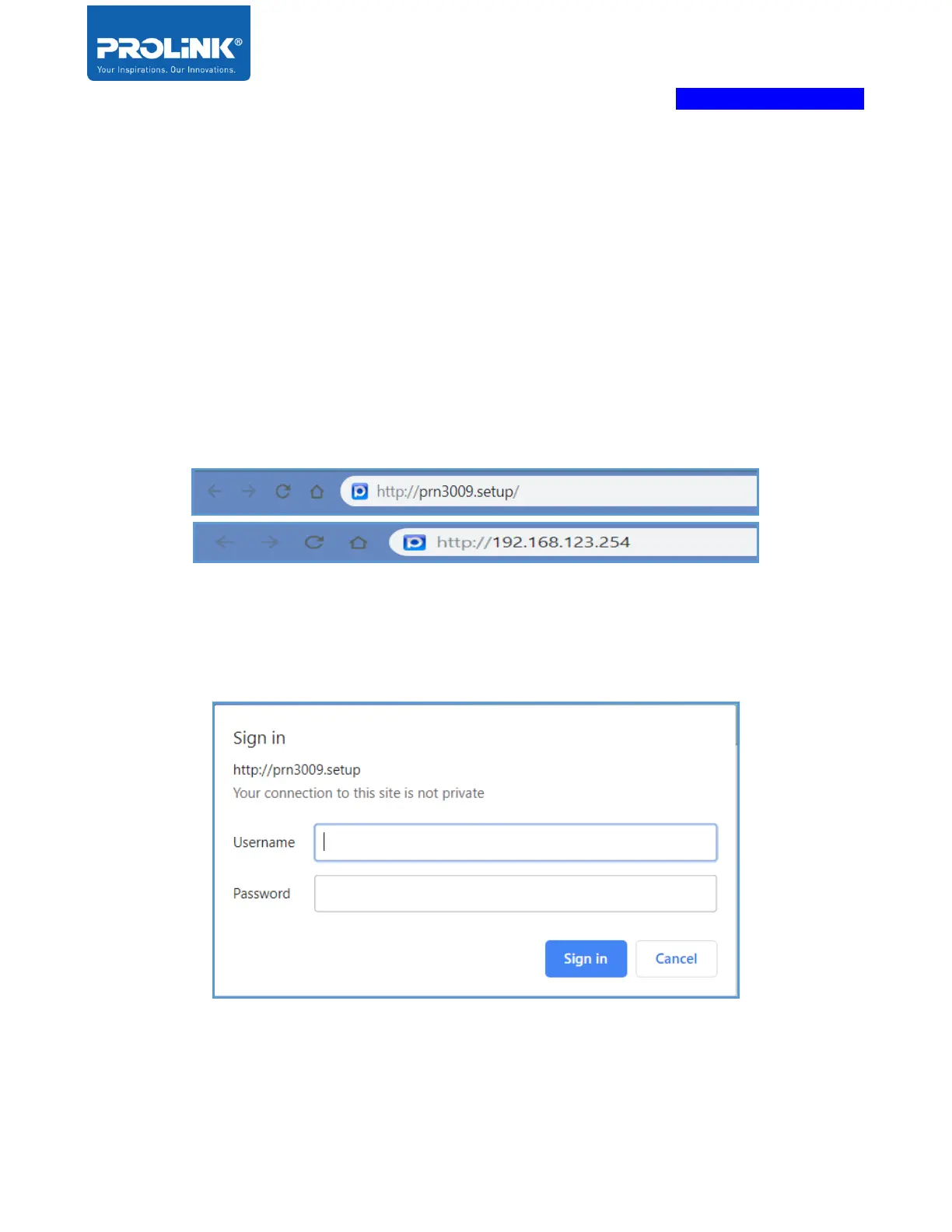 “http://192.168.123.254”, or enter default Domain Name “http://prn3009.setup/”.
