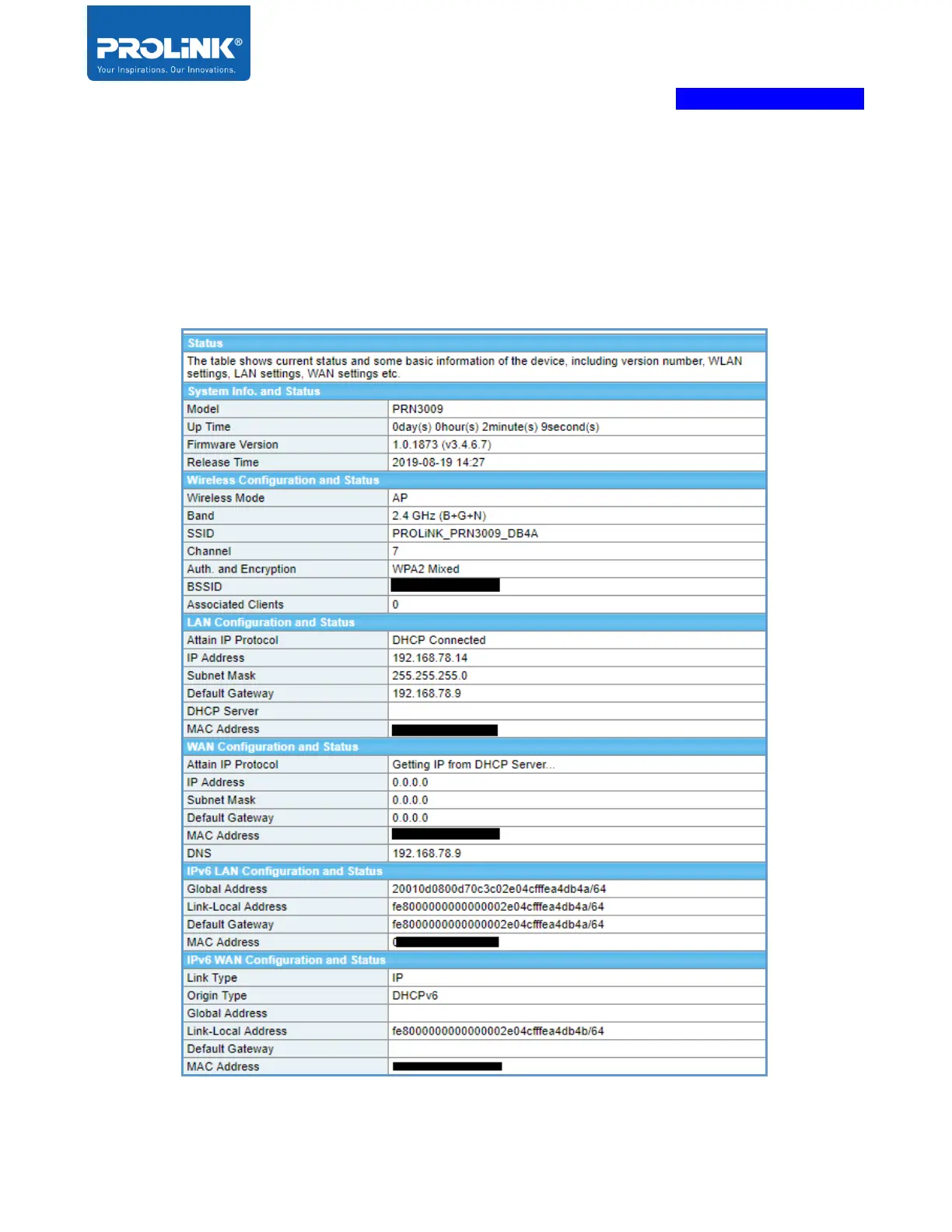 PROLiNK PRN3009 - Access Point (AP) Mode Status