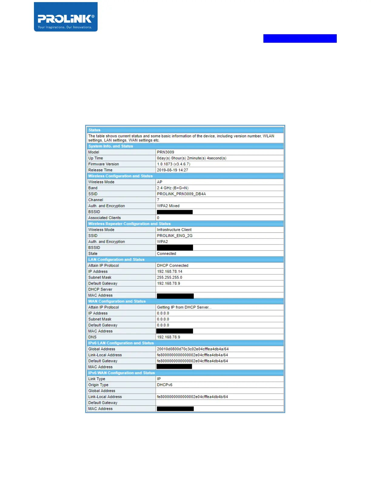 Including the version number, WLAN setting set for the router, LAN and WAN setting and IPV6