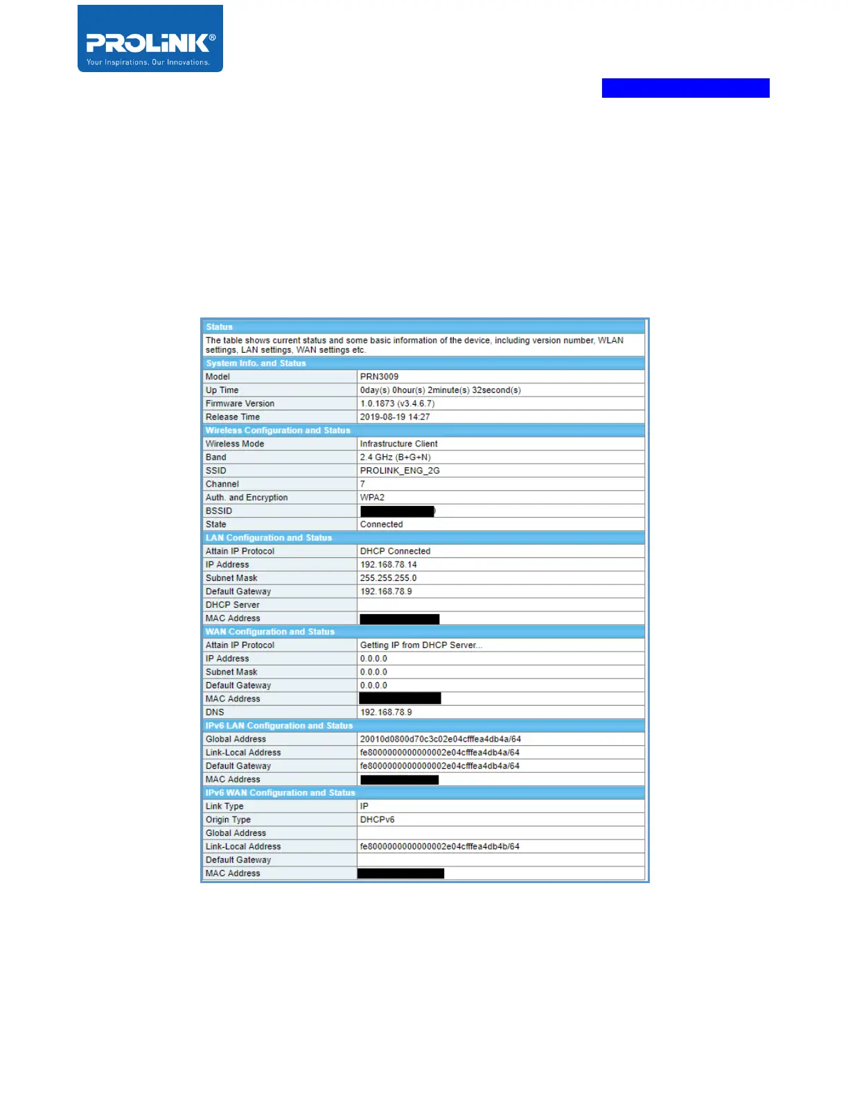 Including the version number, WLAN setting set for the router, LAN and WAN setting and IPV6