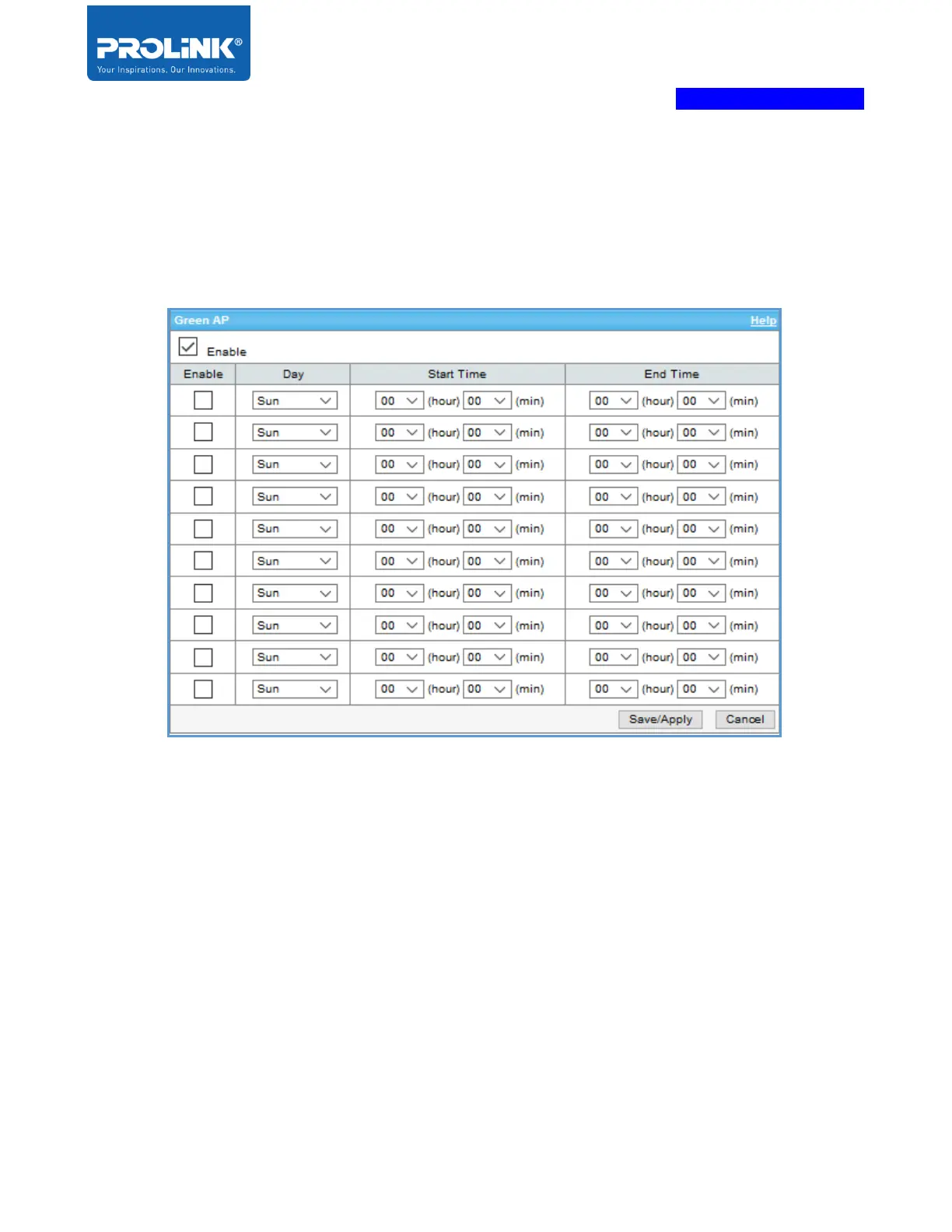 Green AP allows the user to set up the wireless turning Off and On schedule. Start time is the time the