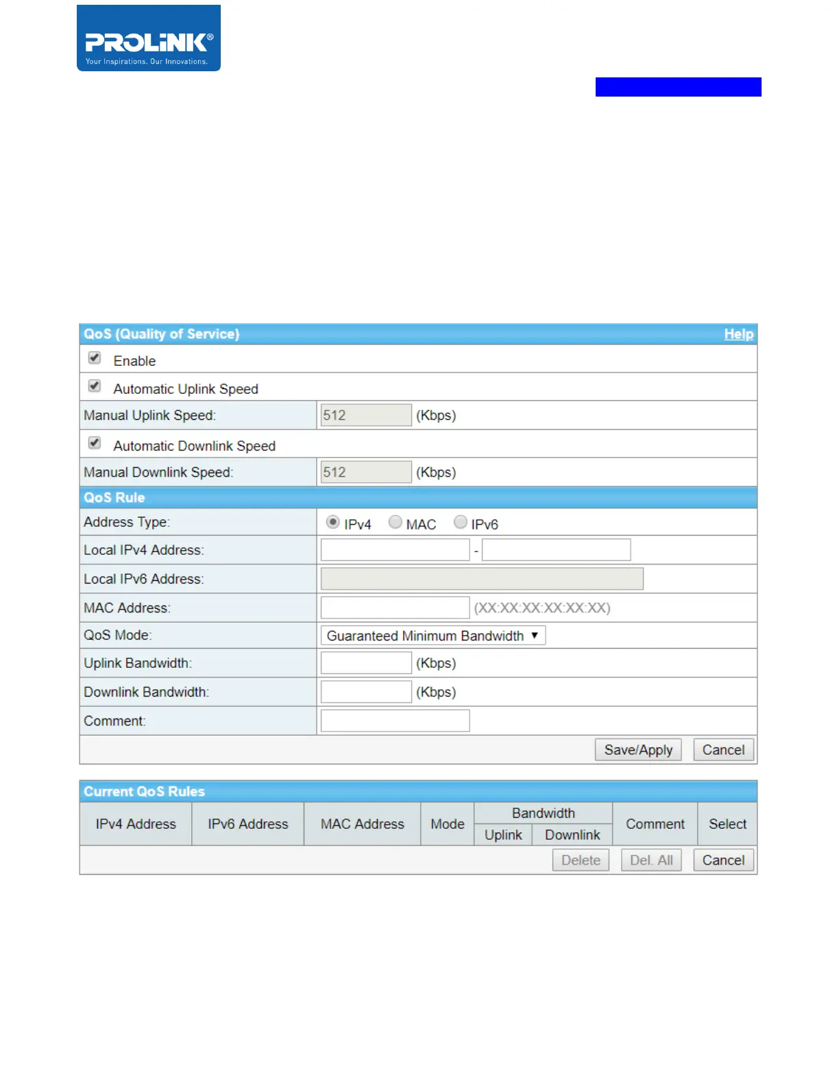 Web. By enable the QoS, user can set specific Upload and Download speed for the PRN3009 and can