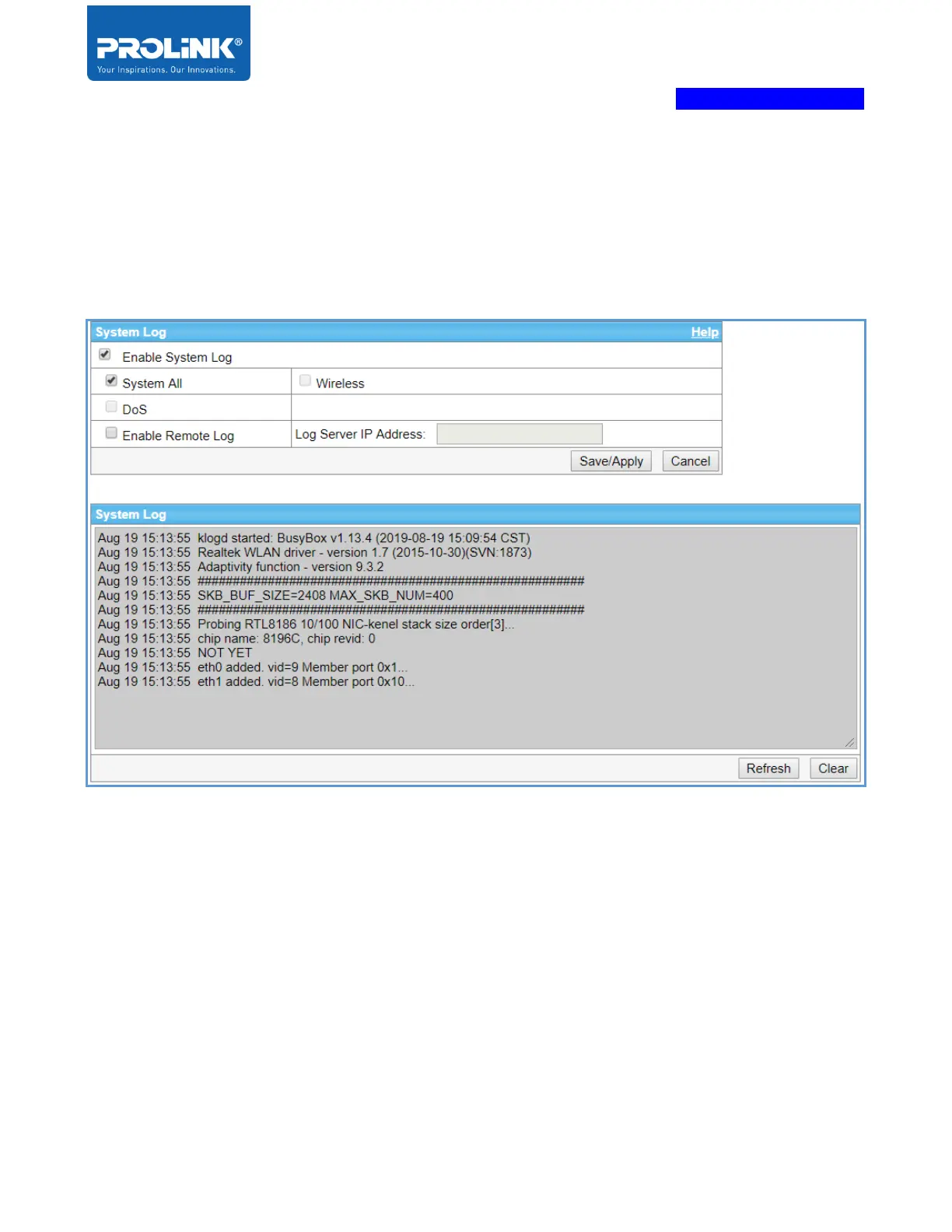 issues. All log will record into System Log Window. By default, the system log is disabled.