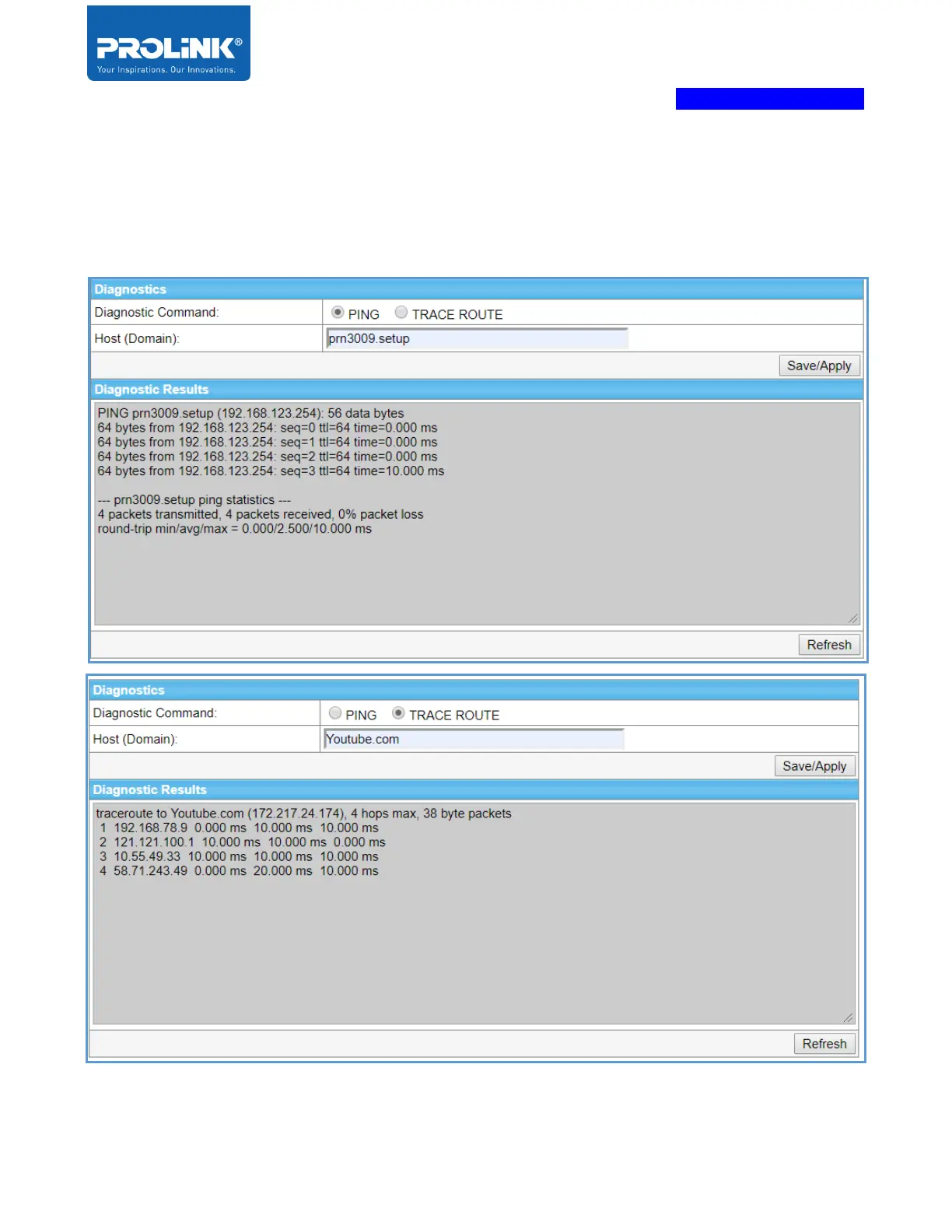 PING and Trace Route. Shows below is the Diagnostic Result table.