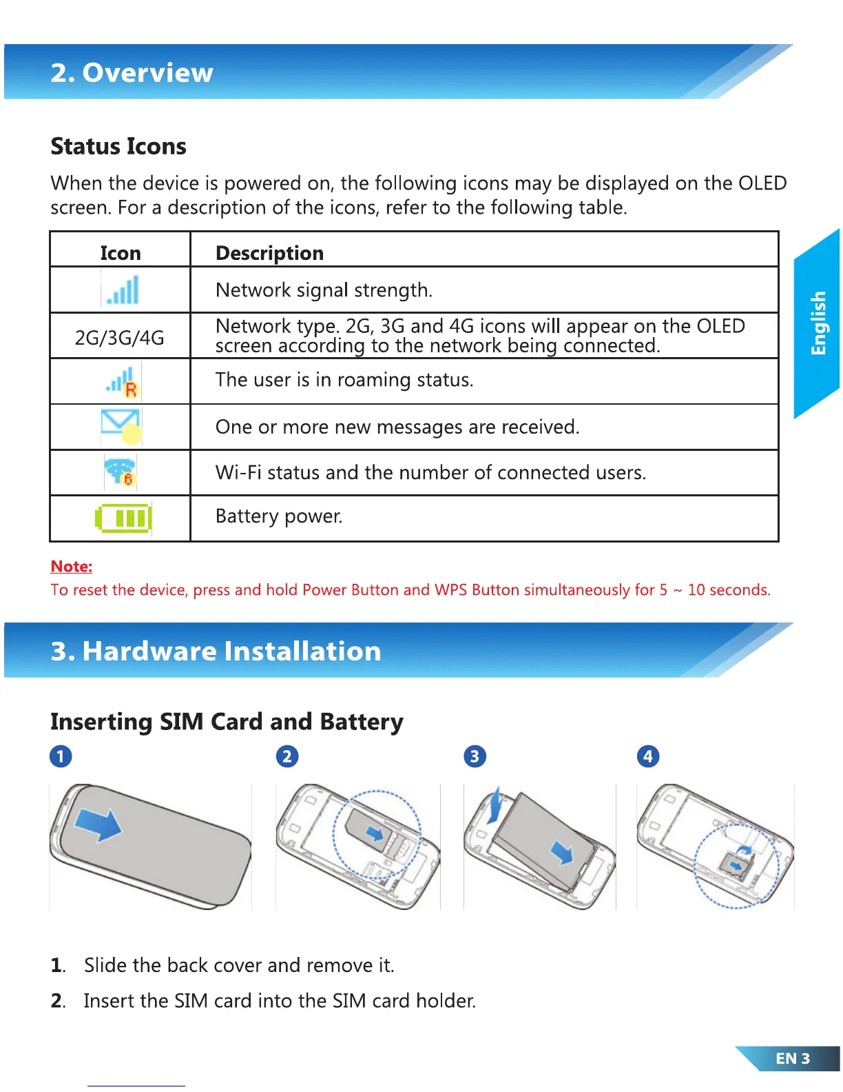 PROLiNK PRT7001H - Status Icons Explained; Hardware Installation Steps; Inserting SIM Card and Battery