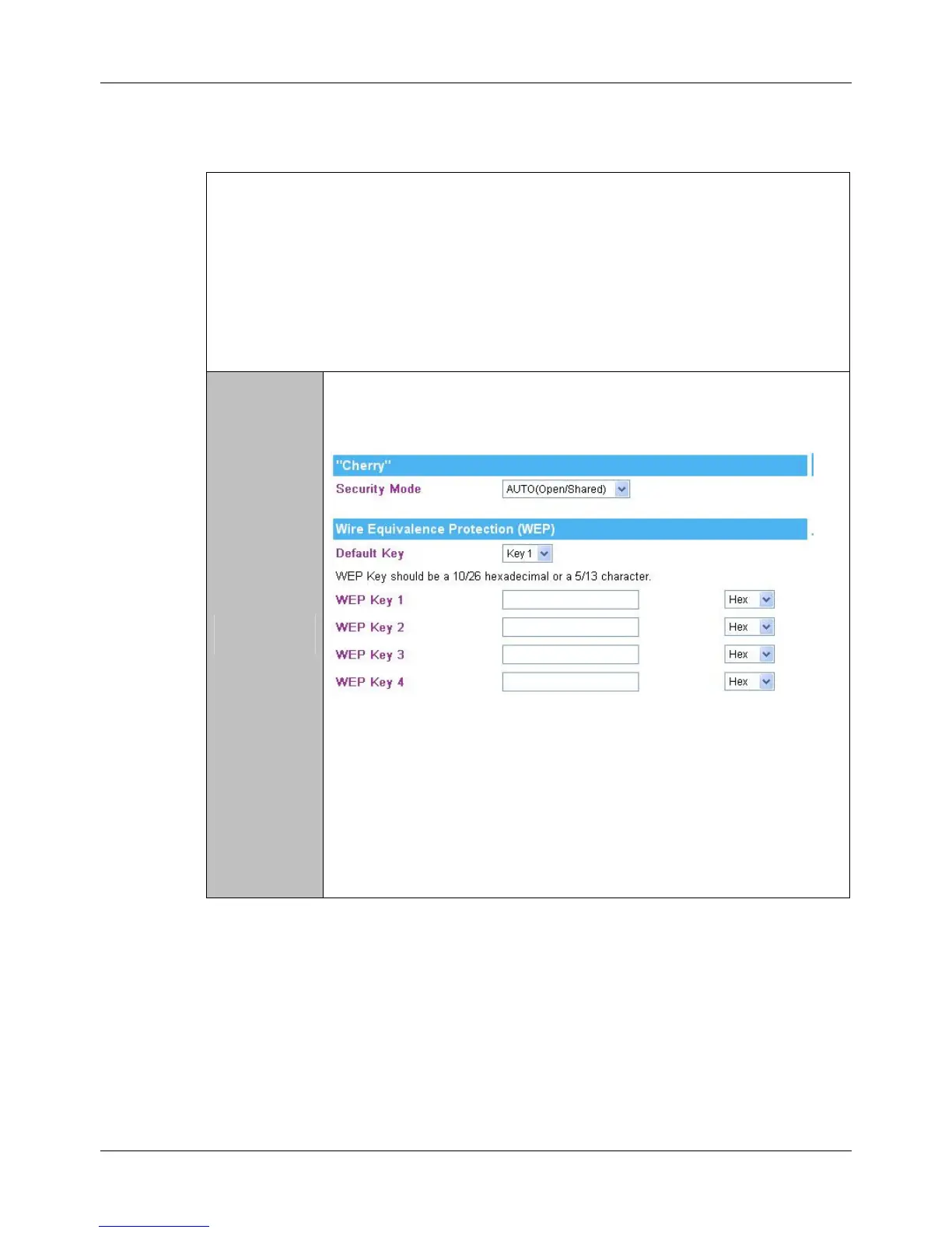 • Hexadecimal (WEP 128 bits): 26 Hex characters (0~9, a~f).