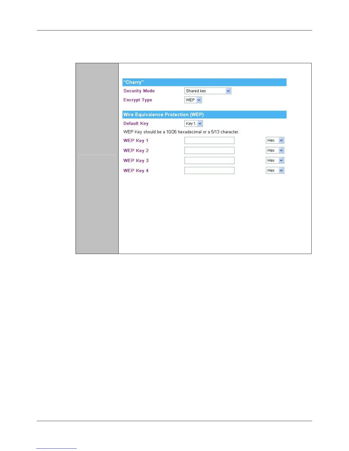 • Hexadecimal (WEP 128 bits): 26 Hex characters (0~9, a~f).