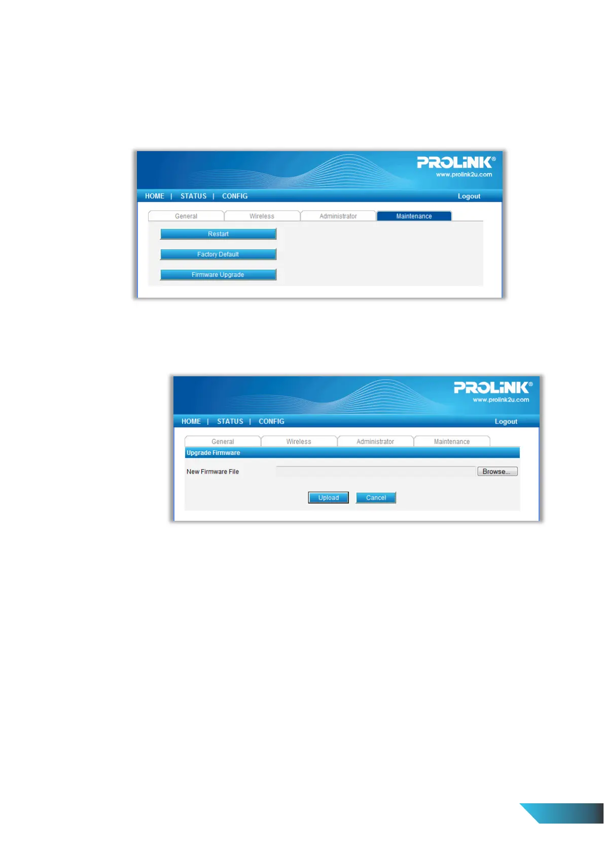 o Firmware Upgrade: click Browse to find the firmware file to be upgraded. Click Upload to