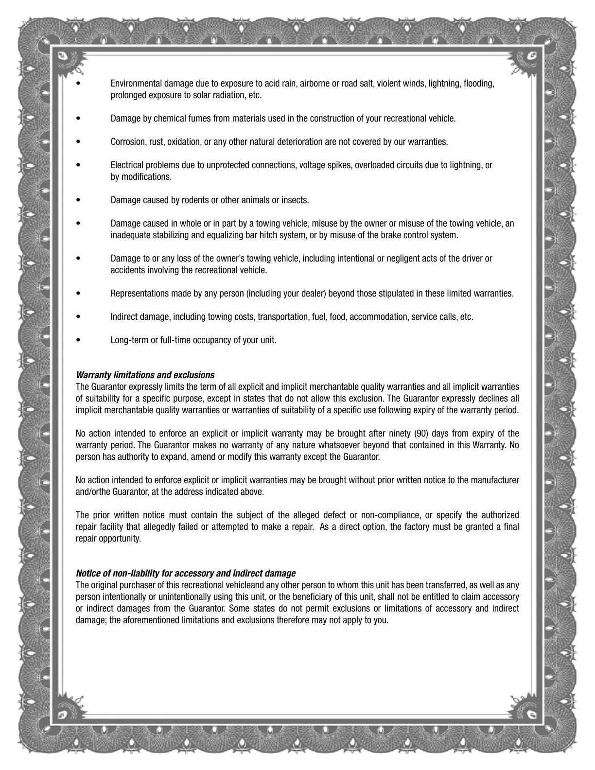 • Damage by chemical fumes from materials used in the construction of your recreational vehicle.