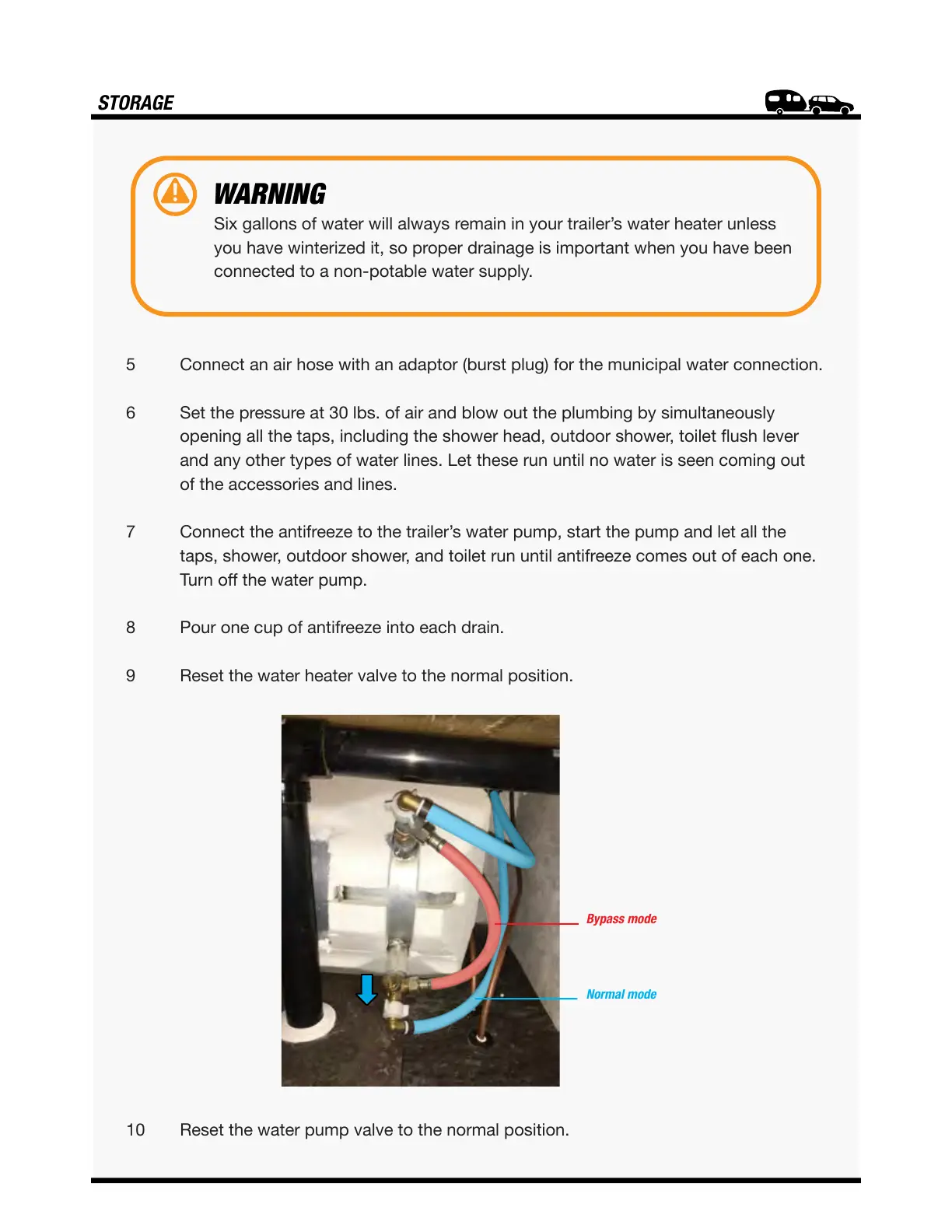 7 Connect the antifreeze to the trailer’s water pump, start the pump and let all the