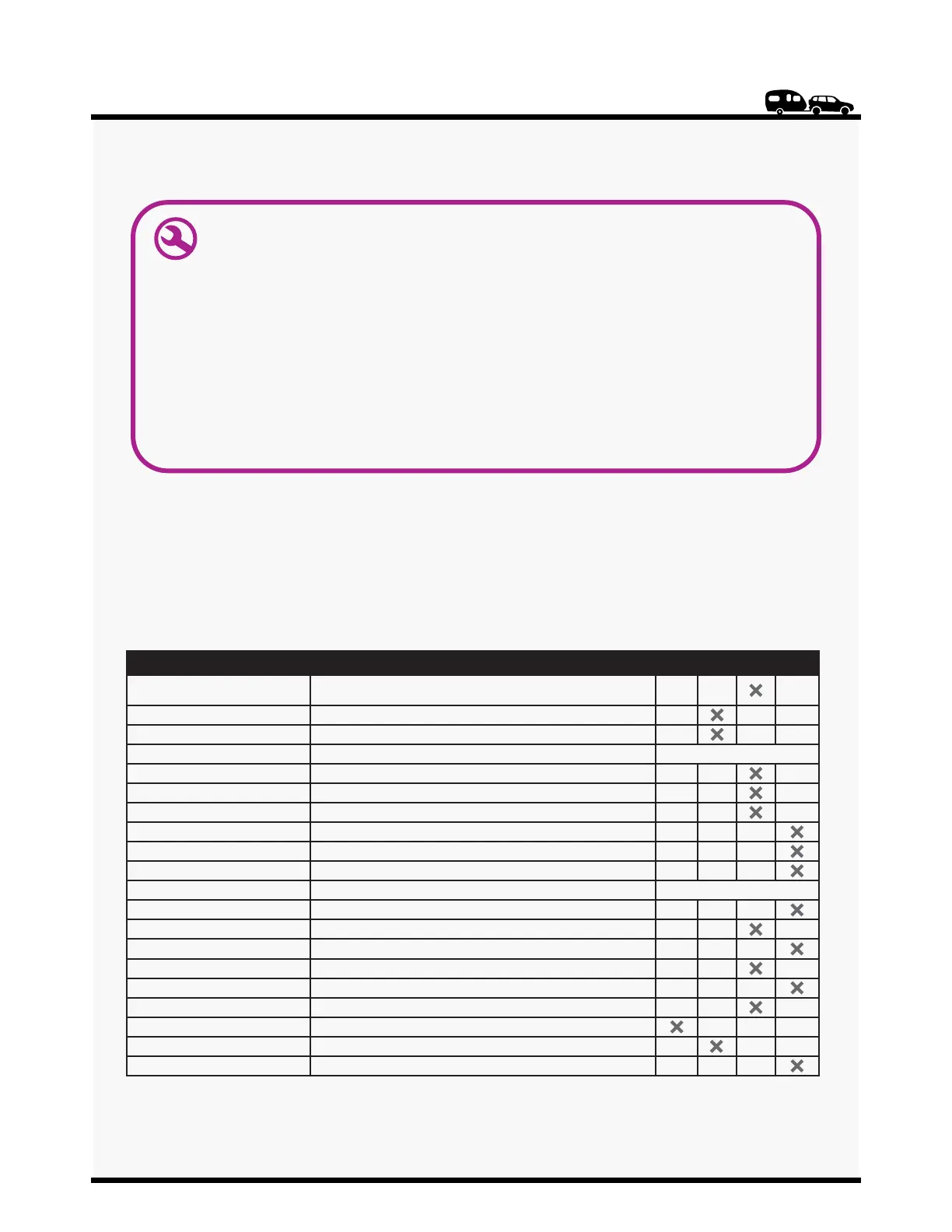 * It is important to comply with all actions required for maintenance of your trailer, as indicated in the maintenance calendar above. Failure to do so may void the Frameco warranty.