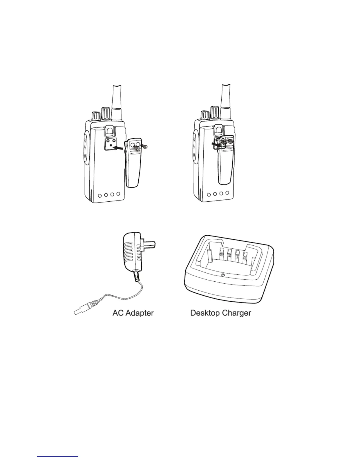 Align the screw eyelets of the belt clip with those on rear of radio and