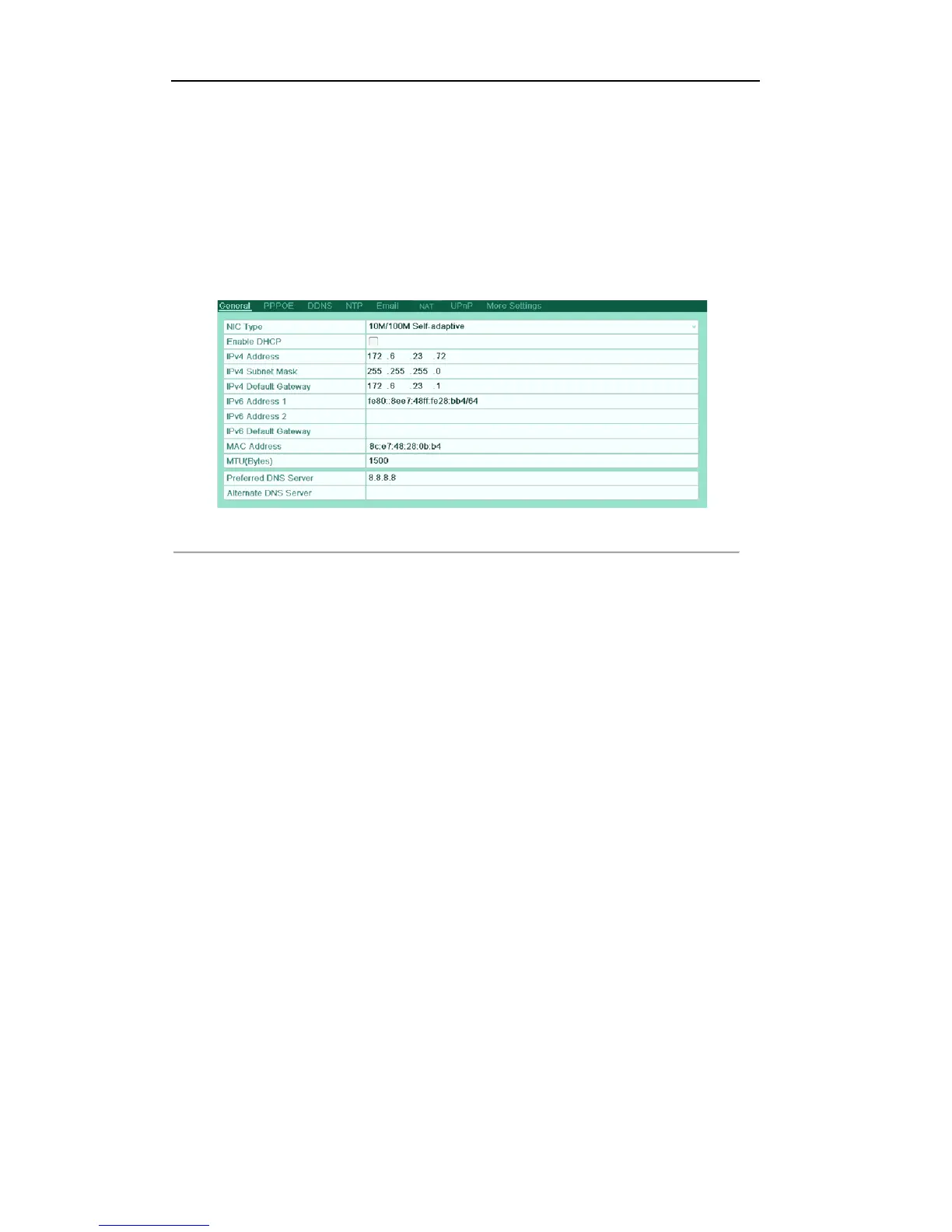 You can configure the following settings: NIC Type, IPv4 Address, IPv4 Gateway, MTU and DNS