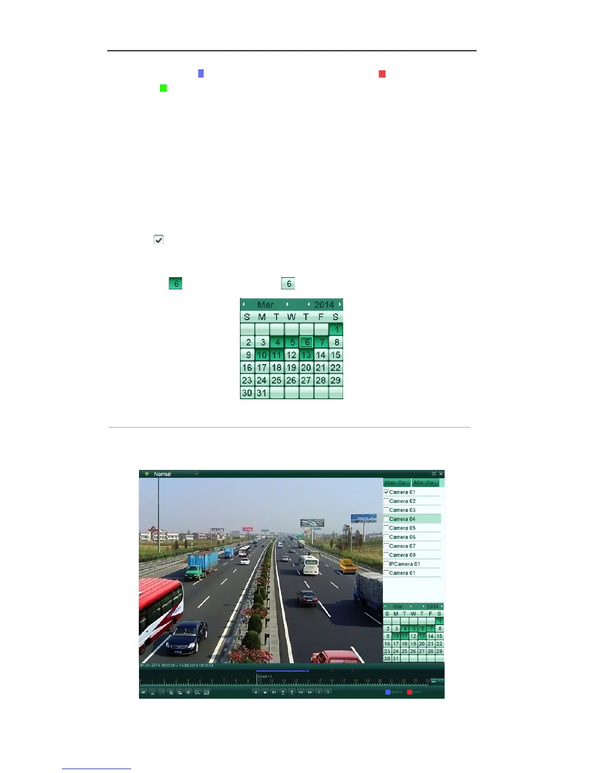 Note: If there are record files for that camera in that day, in the calendar, the icon for that day is