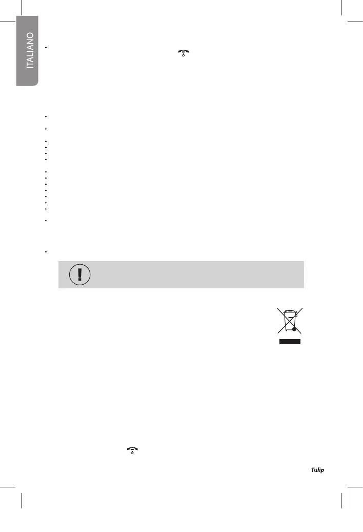 Non tenere il telefono in locali da bagno o nella doccia. Il telefono e la base non sono protetti dagli spruzzi d’acqua.