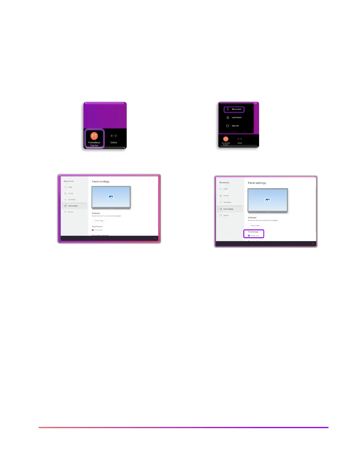 To change your onscreen time format on an ActivPanel 9 using the User profile menu:
