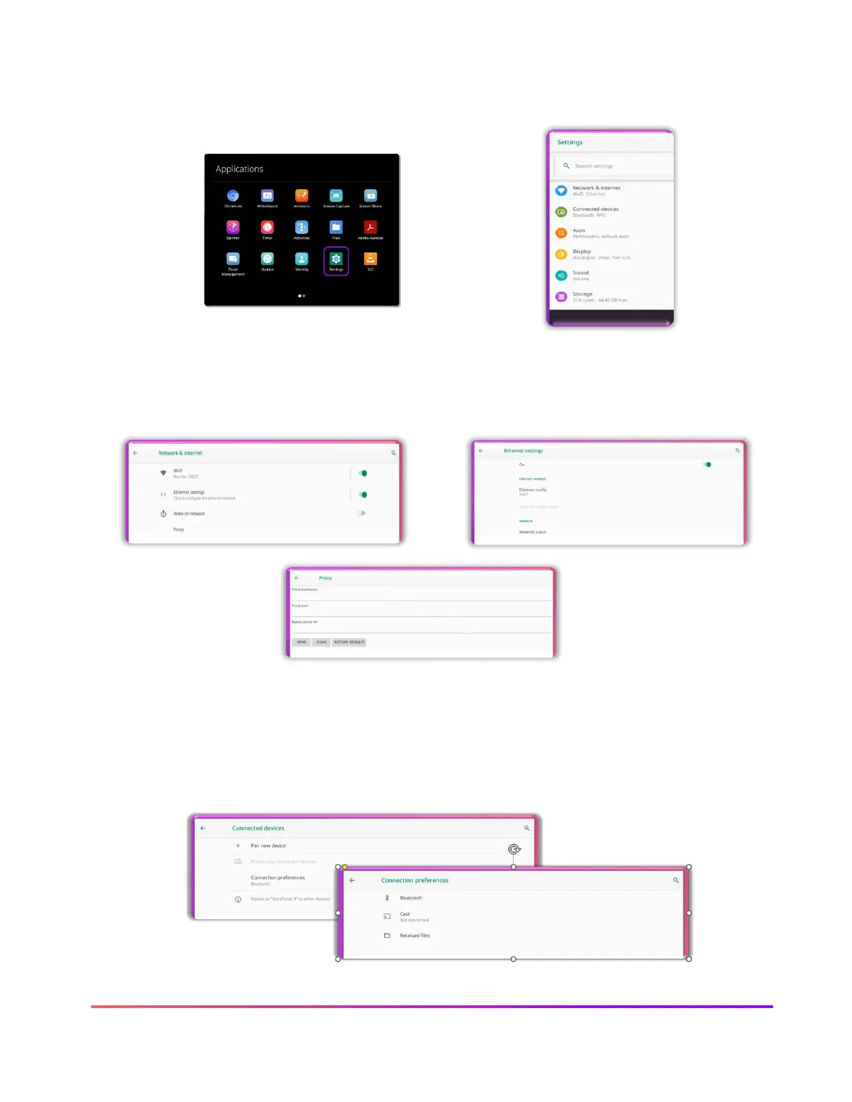 Selecting Settings from the Applications Menu give you access to many ActivPanel Settings
