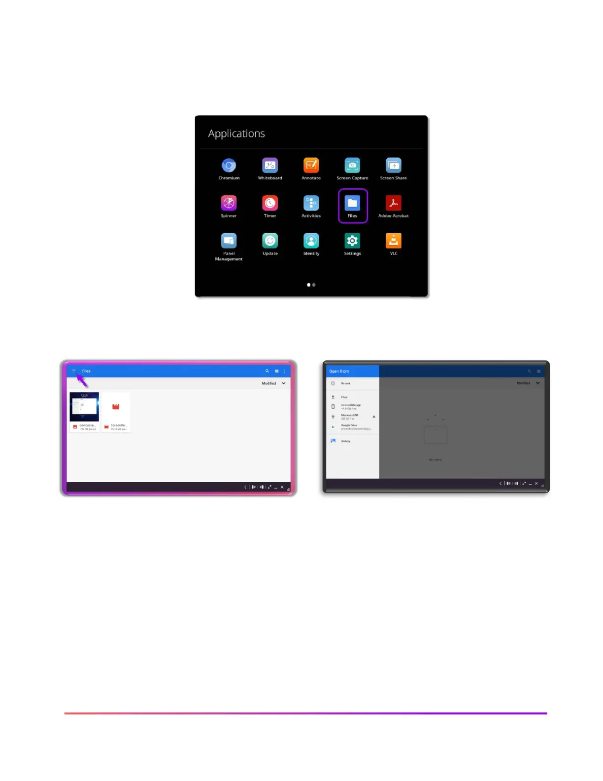 on the ActivPanel 9. Files are easily accessible by selecting Applications, then Files. You may also