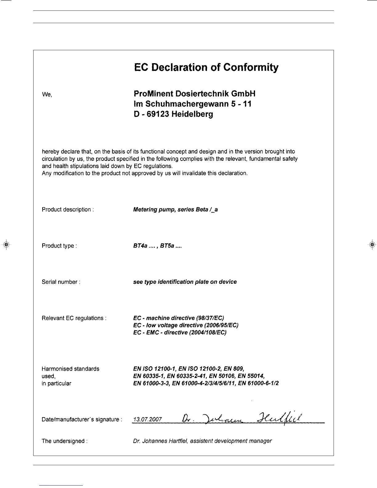 ProMinent Beta BT5a - EC Declaration of Conformity