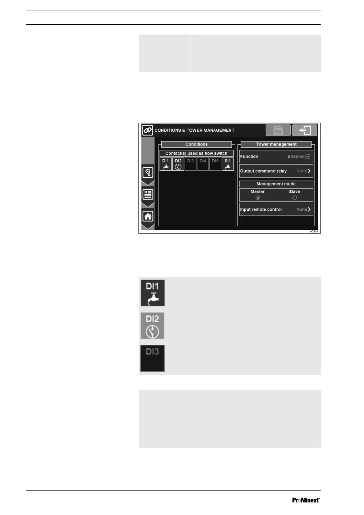 In this menu the flow switch conditions and tower management can
