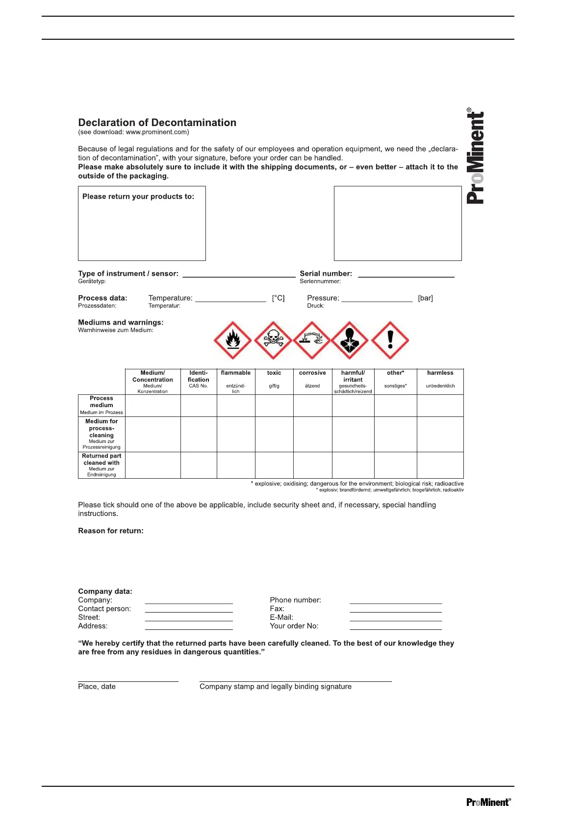 ProMinent Sigma 2 S2Ca - 16 Decontamination Declaration
