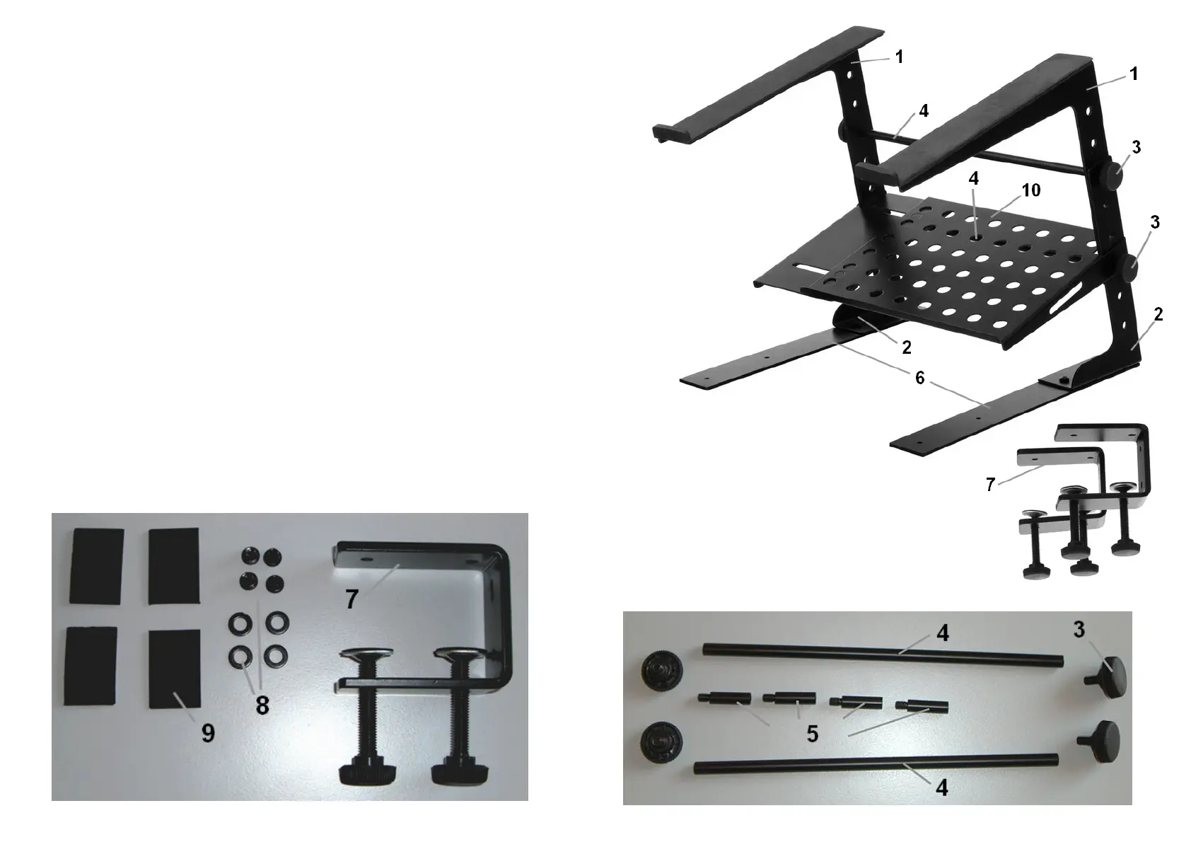 laptop stand with additional ground plates (6) or clamps (7) to fix the stand on a table top.