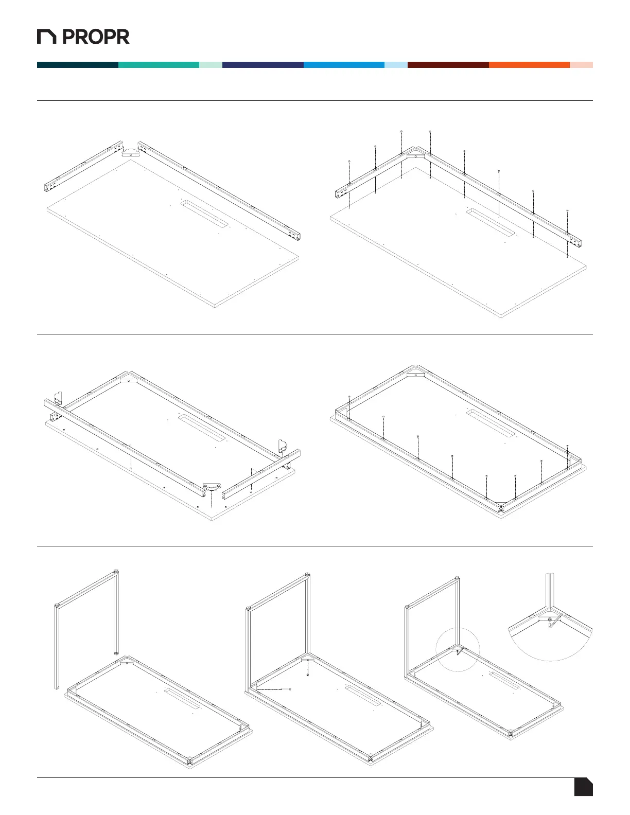 1. Lay down the lateral support #3 and horizontal support #2 and hook the corner bracket #5 before screwing down the supports with #9.