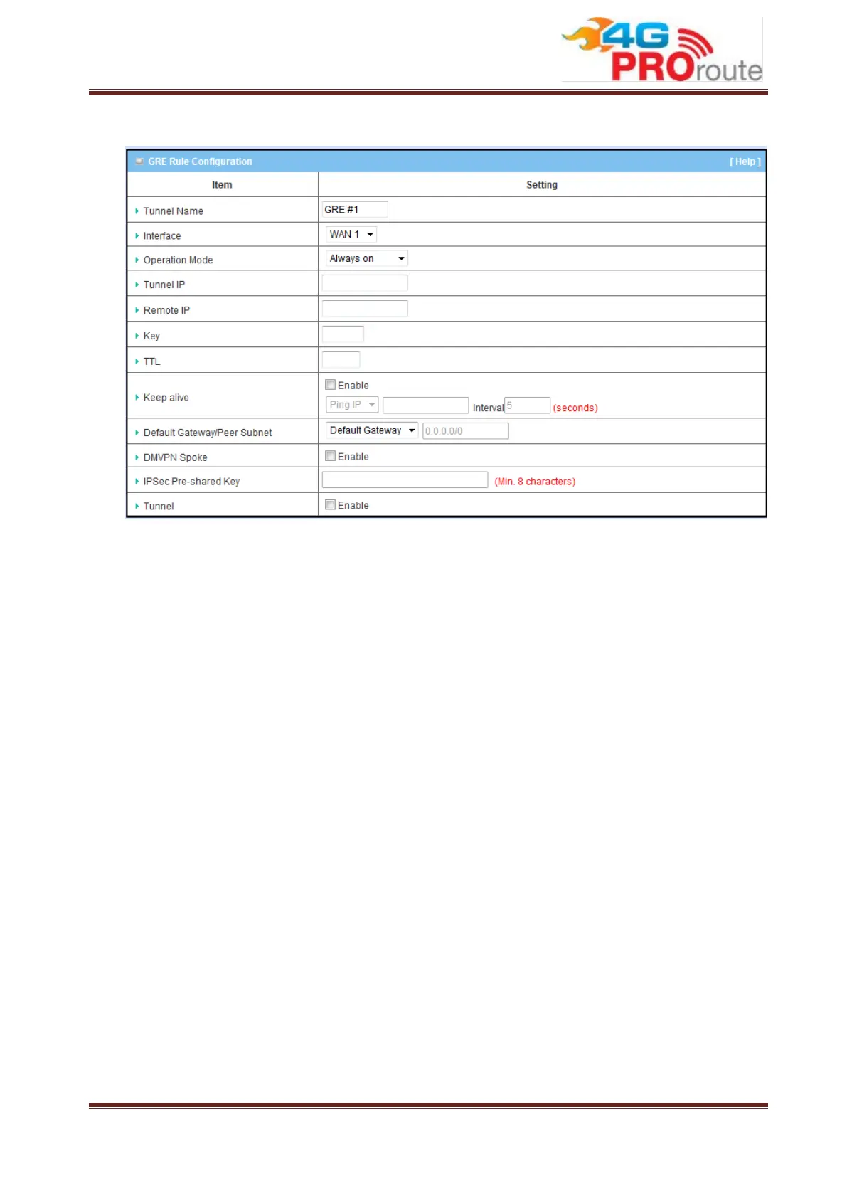 6. Key: Enter the password to establish GRE tunnel with remote host.