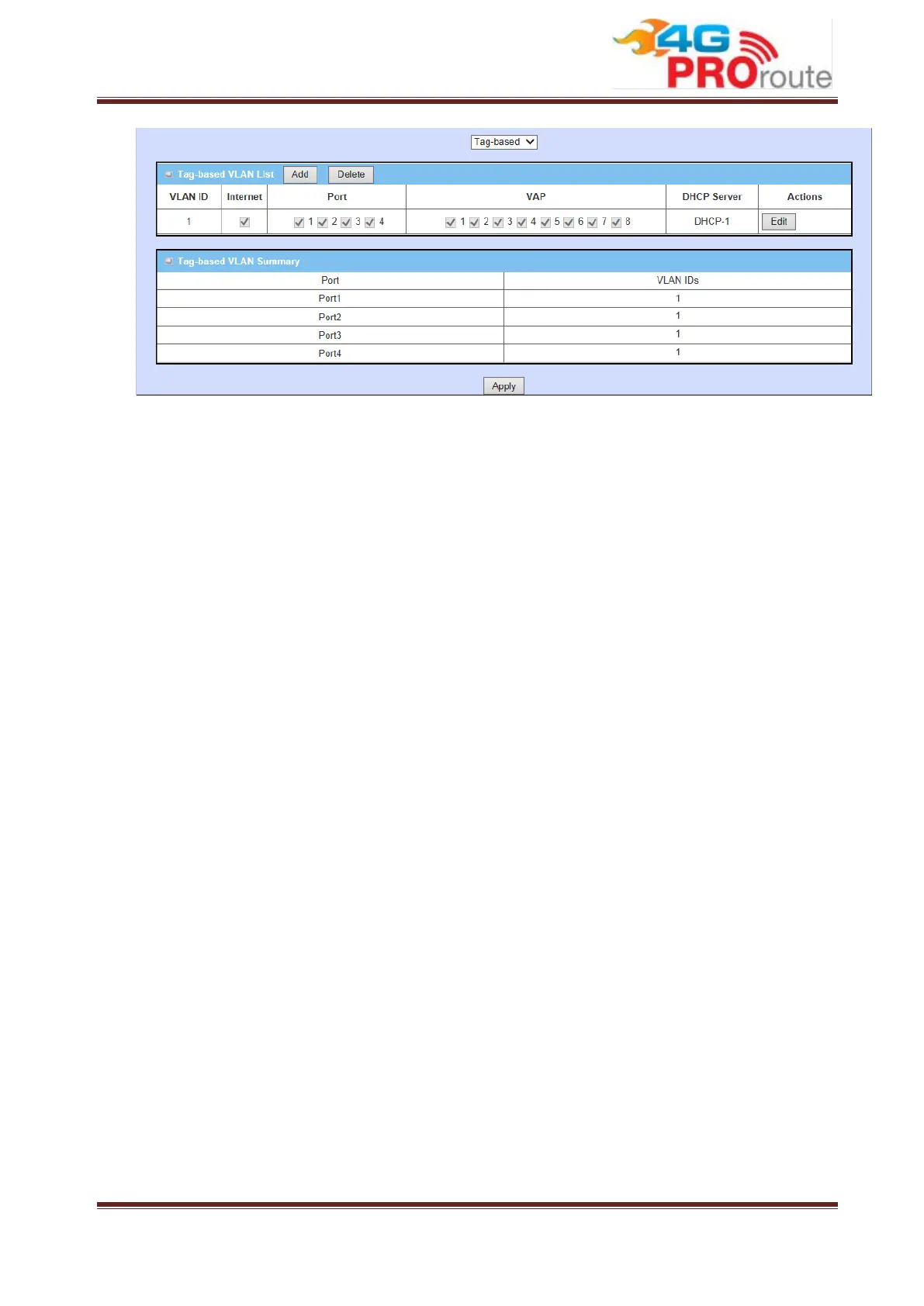 3. Port-1 ~ Port-4, VAP-1 ~ VAP-8: Specify whether they belong to the VLAN group