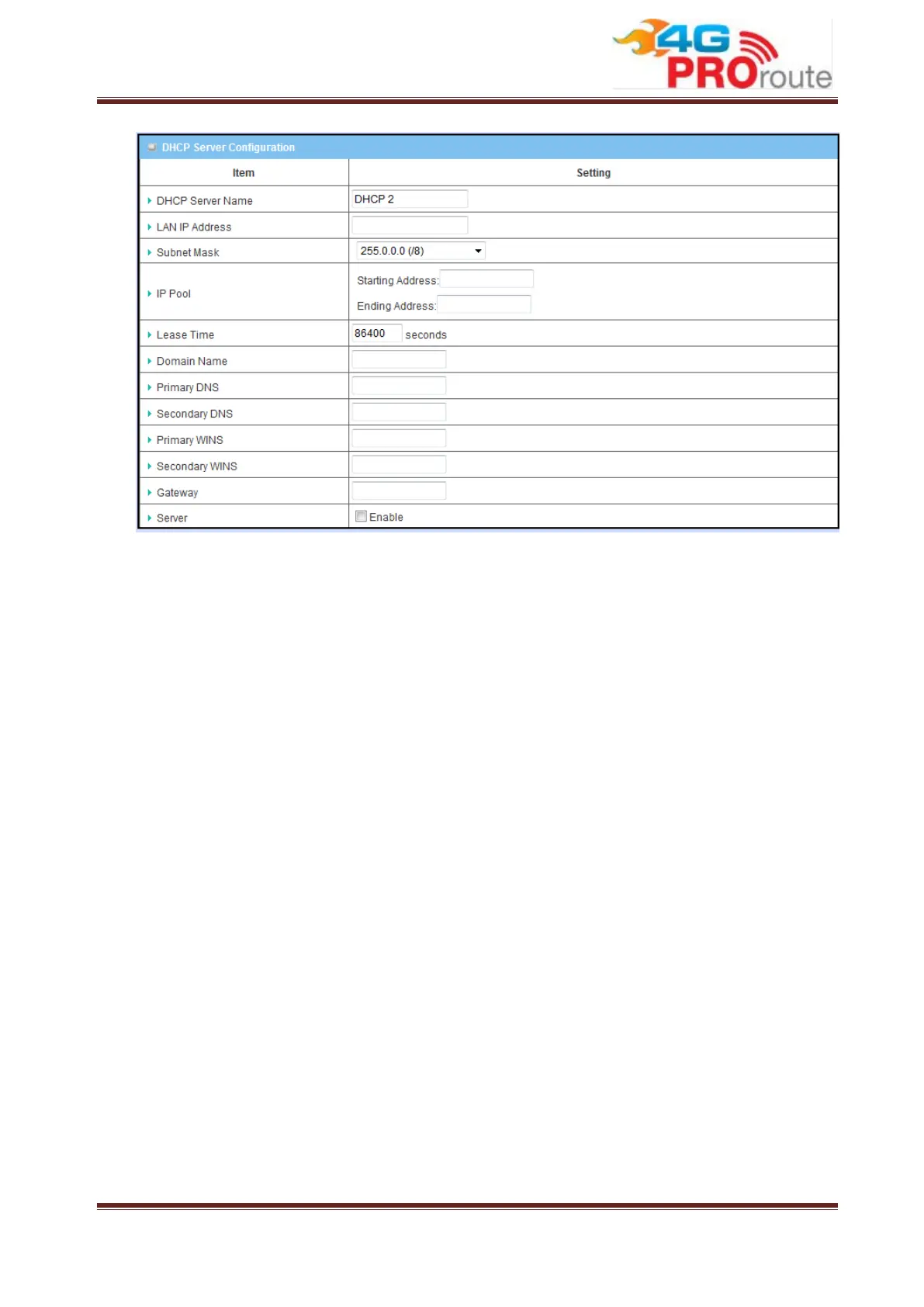 2. LAN IP Address: Specify the local IP address of the enabled DHCP Server. It’s