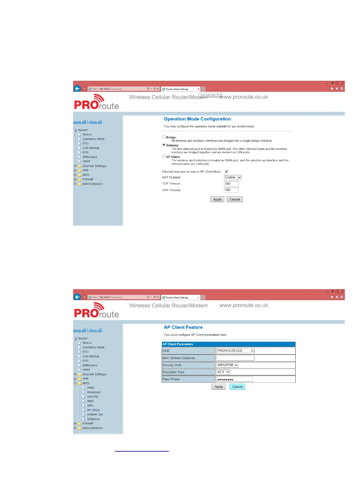 PROROUTEweb‐‐OperationMode–Choose“APClient”,andclickapplybutton.Waitsome