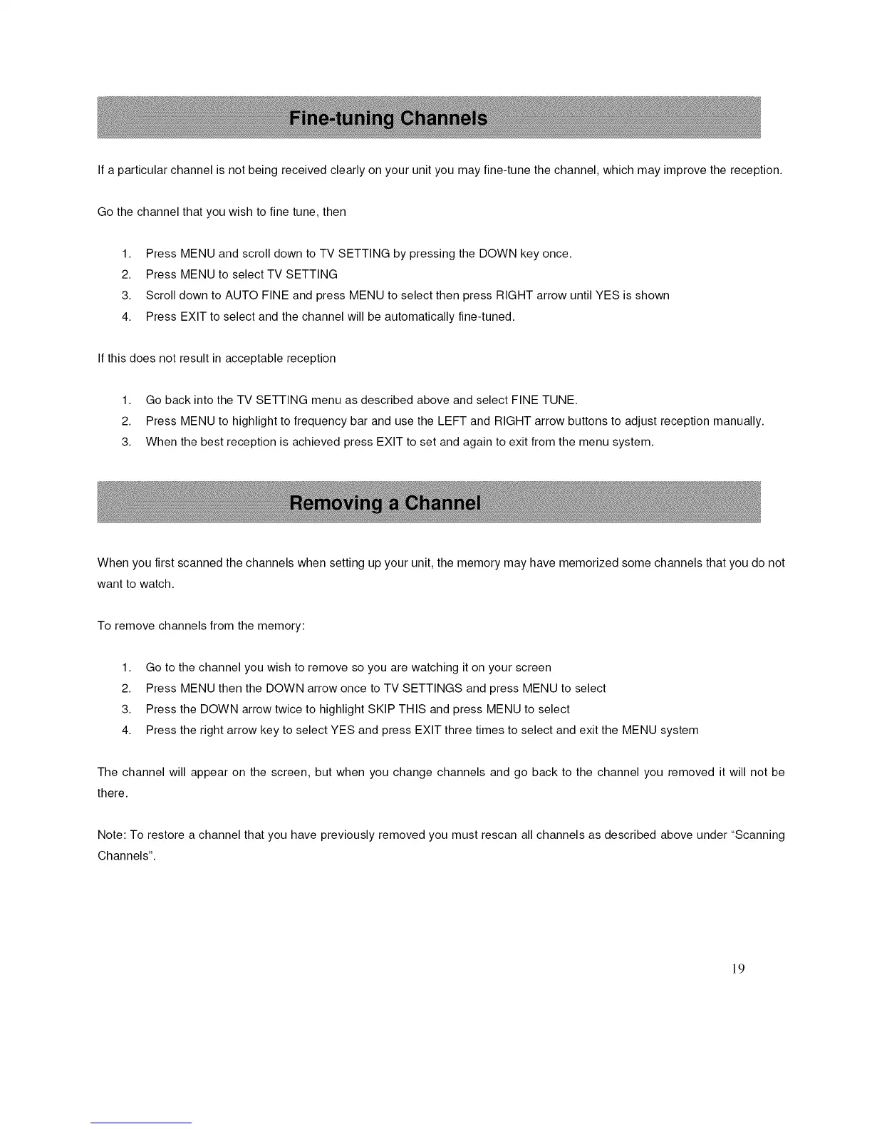 Note: To restore a channel that you have previously removed you must rescan all channels as described above under "Scanning
