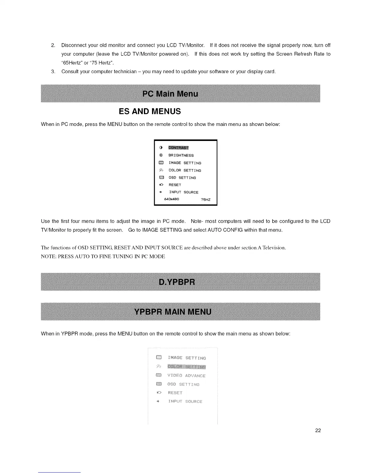 Use the first four menu items to adjust the image in PC mode. Note- most computers will need to be configured to the LCD