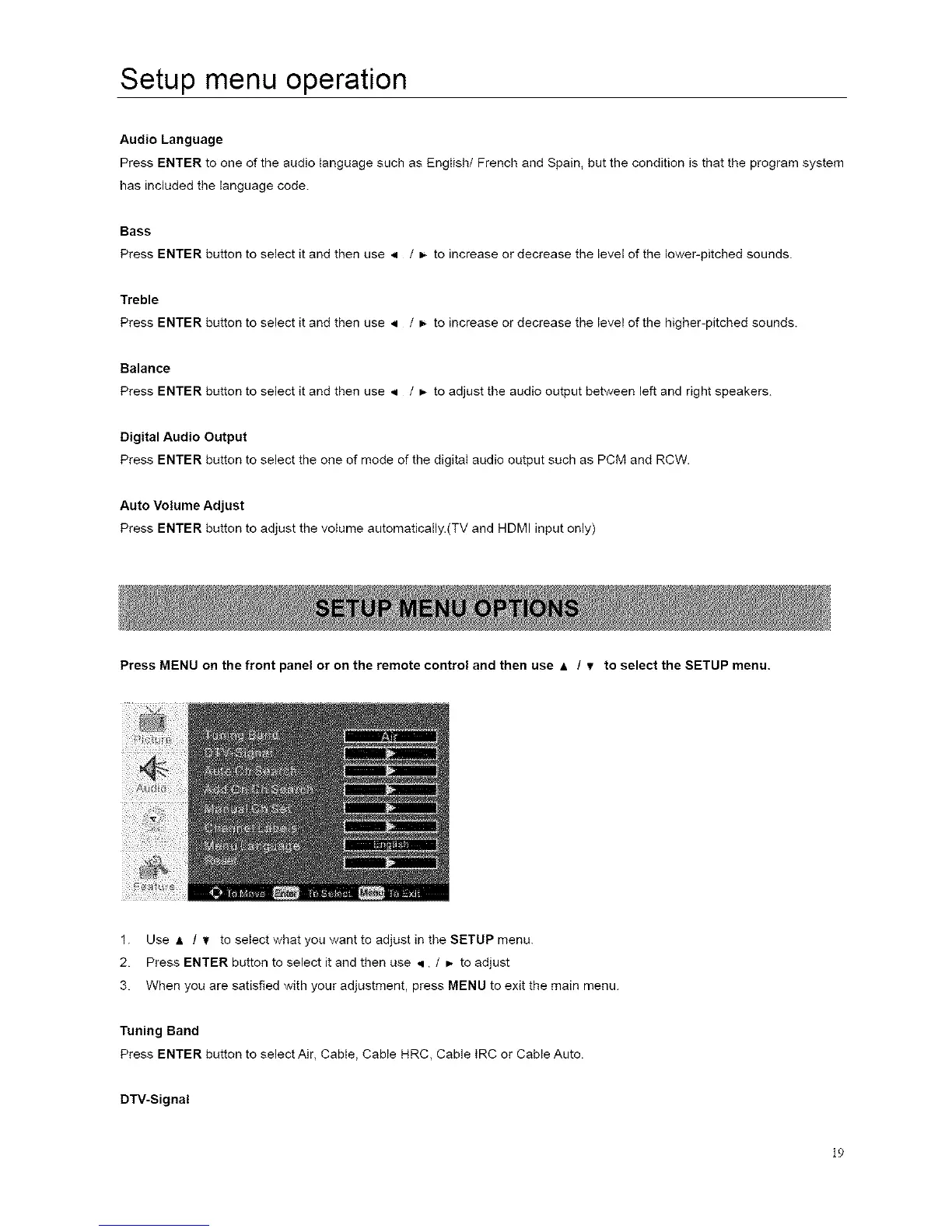 Press ENTER button to adjust the voIume automatically.(TV and HDMI input only)