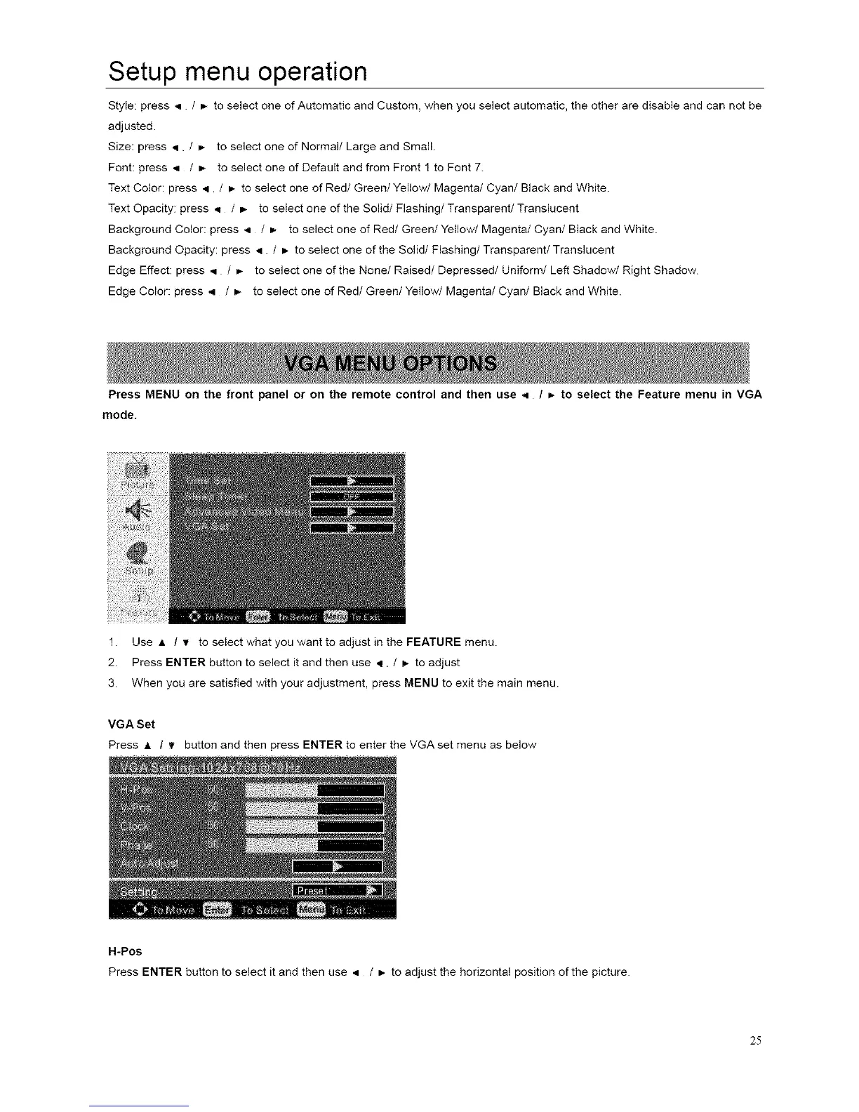 Press • / _ button and then press ENTER to enter the VGA set menu as below